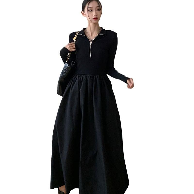 Осеннее Черное Платье с Длинным Рукавом Женское Маленькое Длинное Платье Корейская Версия Новое Женское Теплый Сезон и Осенняя Юбка