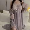 Повседневная женская домашняя одежда Осеннее платье до колена из сетки и кружева однотонное с жакетом-халатом с глубоким V-вырезом и подкладными плечиками