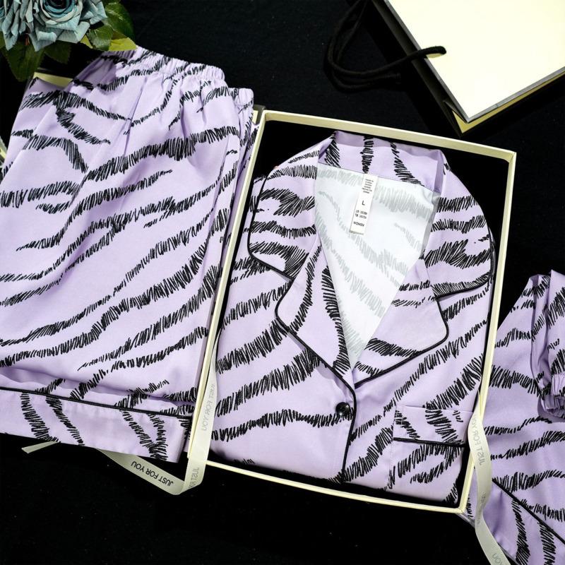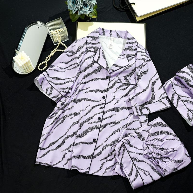 Three-piece Ice Silk Pajamas Women Short-sleeved Suit Purple Tiger Pattern Print Style Pajamas Sexy Home Wear