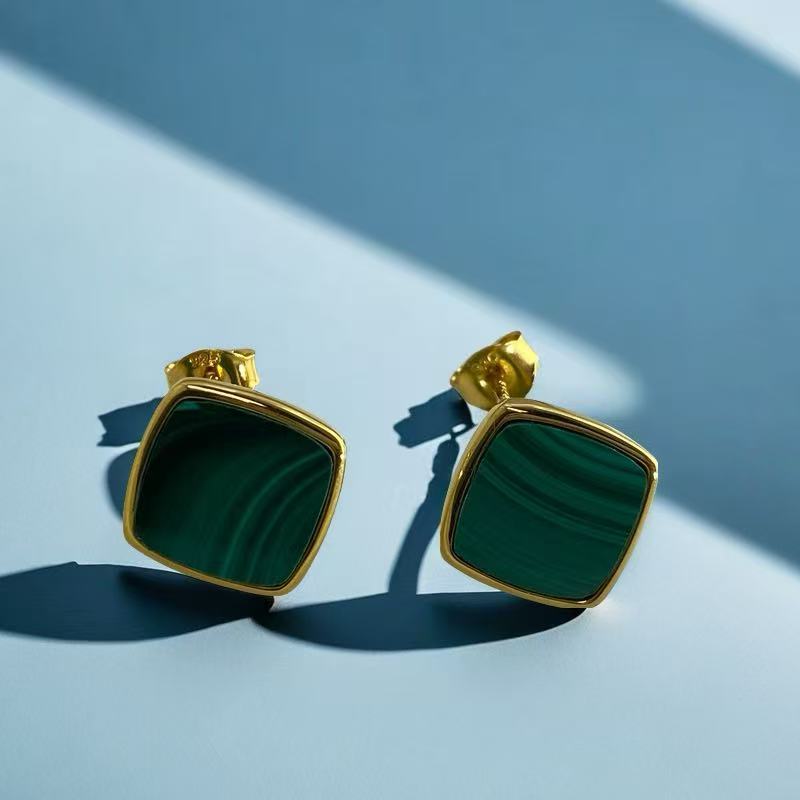 Серьги-гвоздики женские из стерлингового серебра 925 пробы, геометрические, с золотым покрытием, малахит, натуральные камни, элегантные украшения, Bijoux, оптом