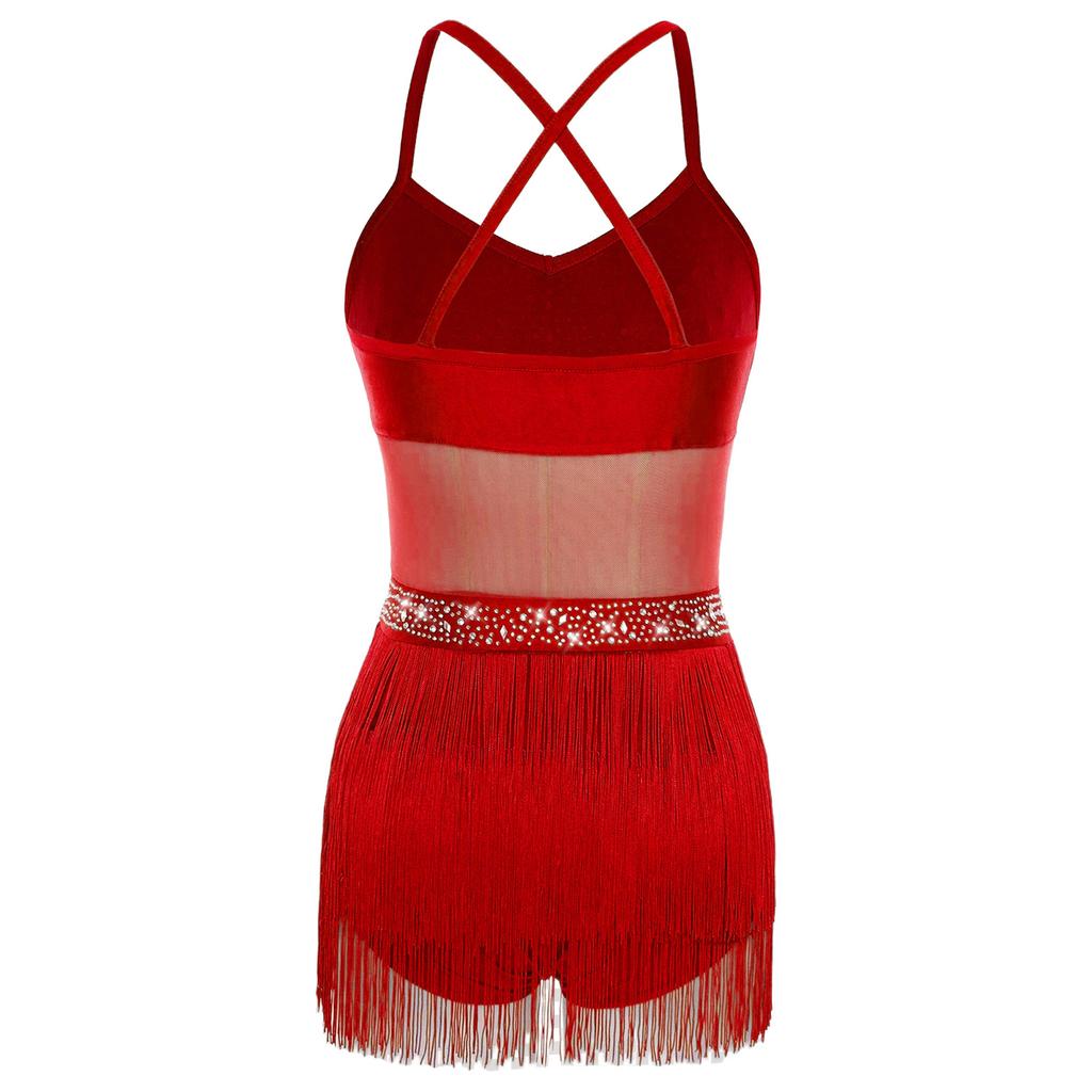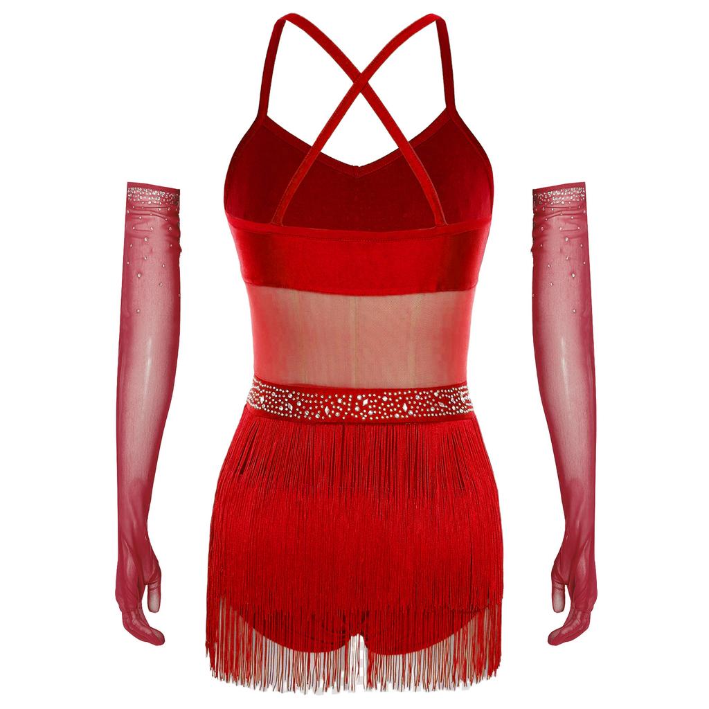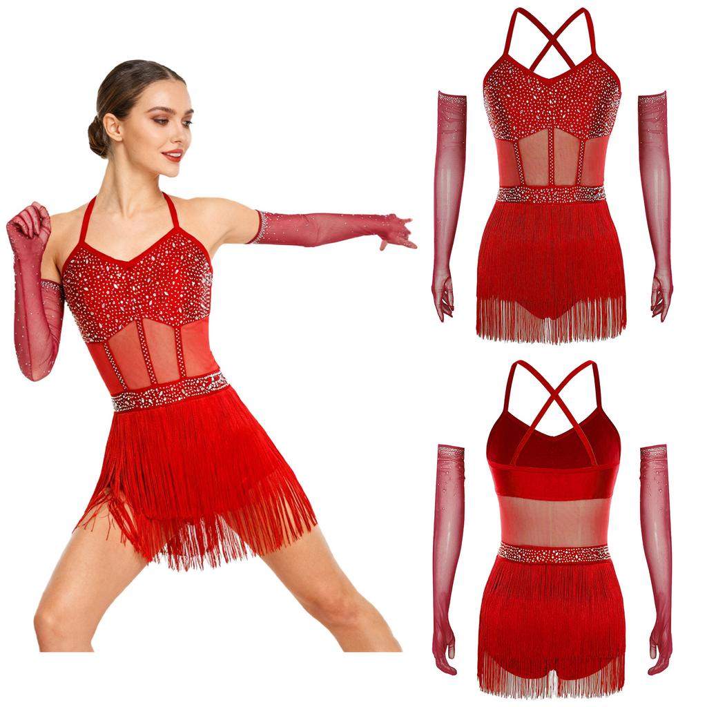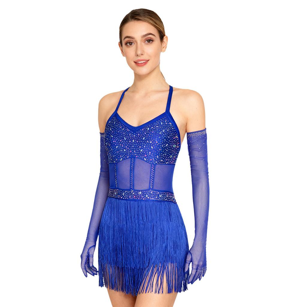 Женское платье для танго и бальных танцев S-XXL: Прозрачный сетчатый боди с многоярусной бахромой, стразами и длинными перчатками