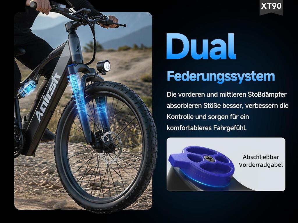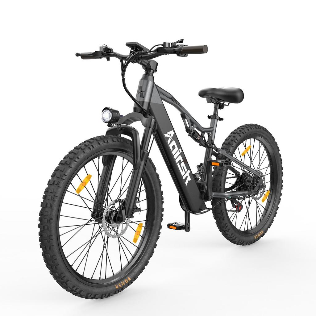 Experience superior comfort on any terrain. The dual suspension electric mountain bike features both front and rear shock absorption to smooth out bumps and vibrations, providing a stable and controlled ride on the most rugged paths.
