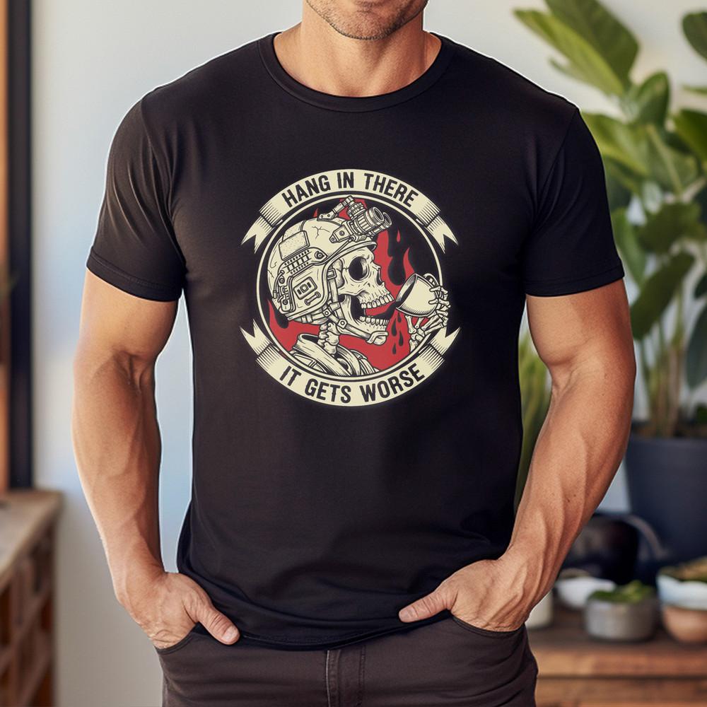 Hang in There It Gets Worse Funny Skeleton Flames Dark Humor T-Shirt Unisex T-Shirt