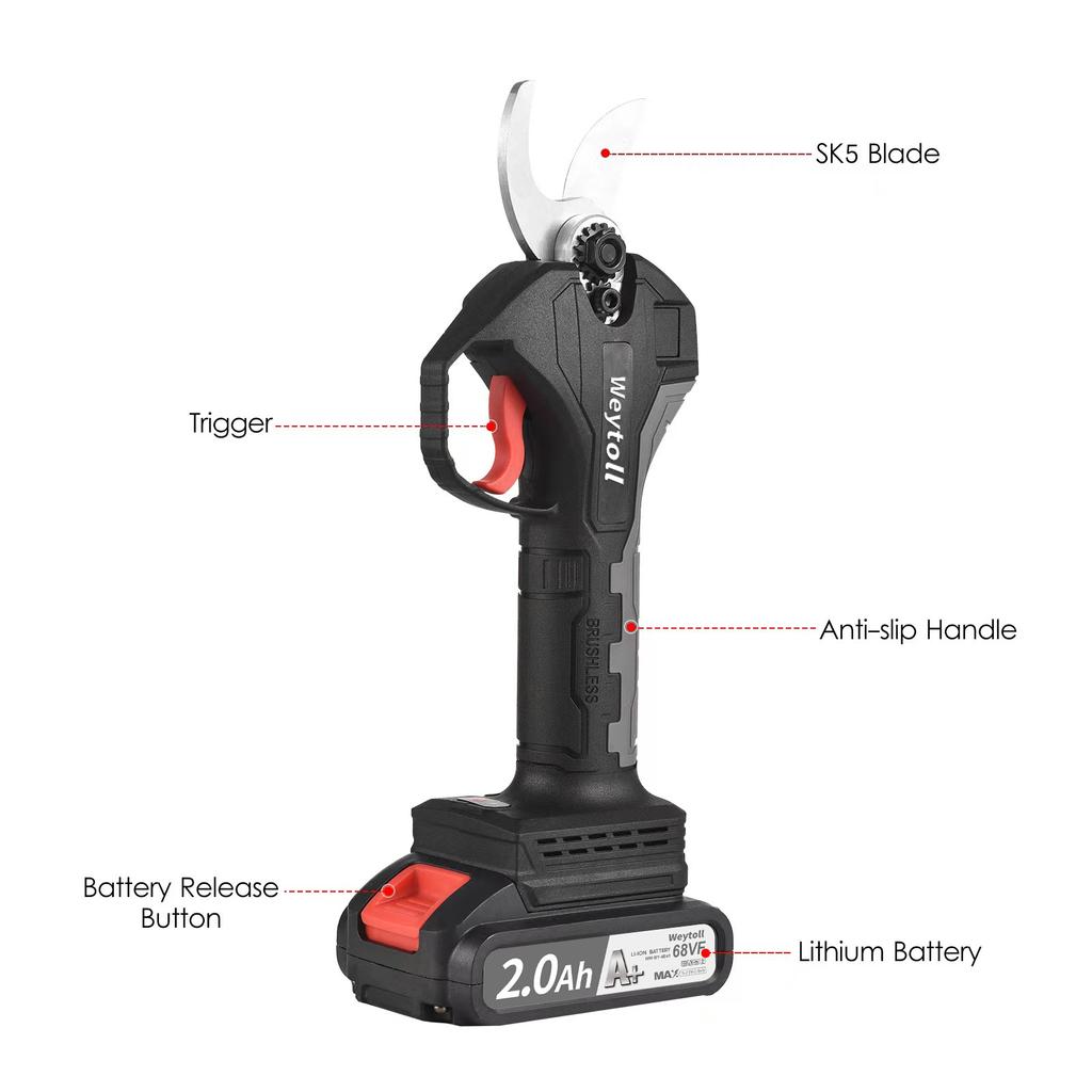 Powerful Brushless Motor -- 21V professional cordless electric pruning shears adopt Brushless Motor which provides 50% more run time, increased by 30% pruning efficiency, also its service life is 3 to 5 times that of a conventional brush motor which greatly save maintenance costs due to motor damage.