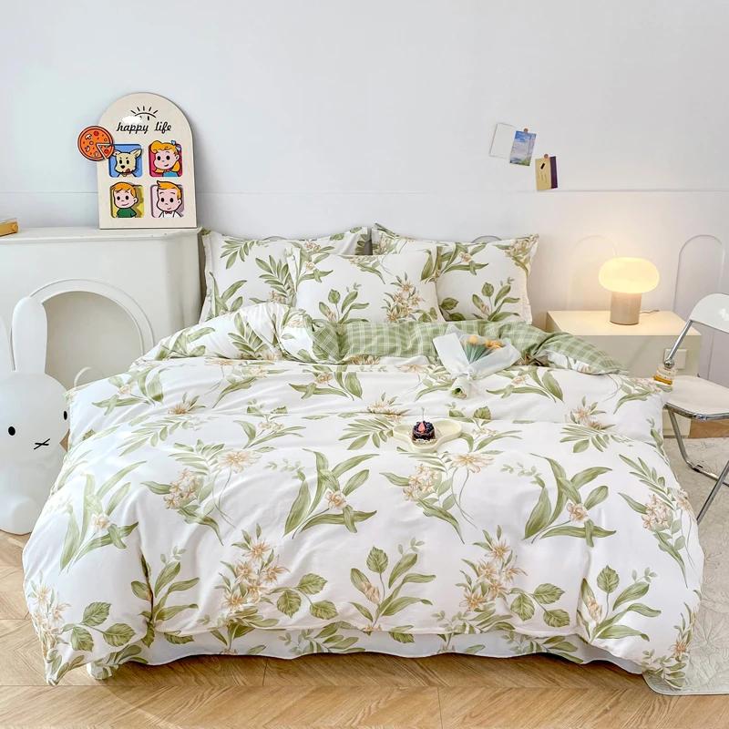 Цветочный пододеяльник в садовом стиле, 100% хлопок, бохо-эстетика, зеленый, с рисунком из разноцветных цветов, 3 предмета