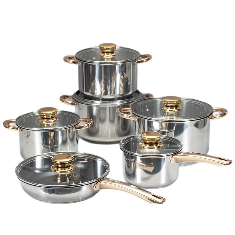 Набор посуды из нержавеющей стали, 12 предметов, с золотыми ручками: Набор кастрюль и сковородок в подарочной упаковке