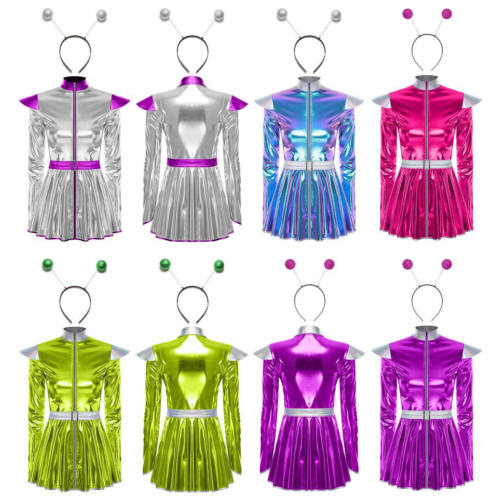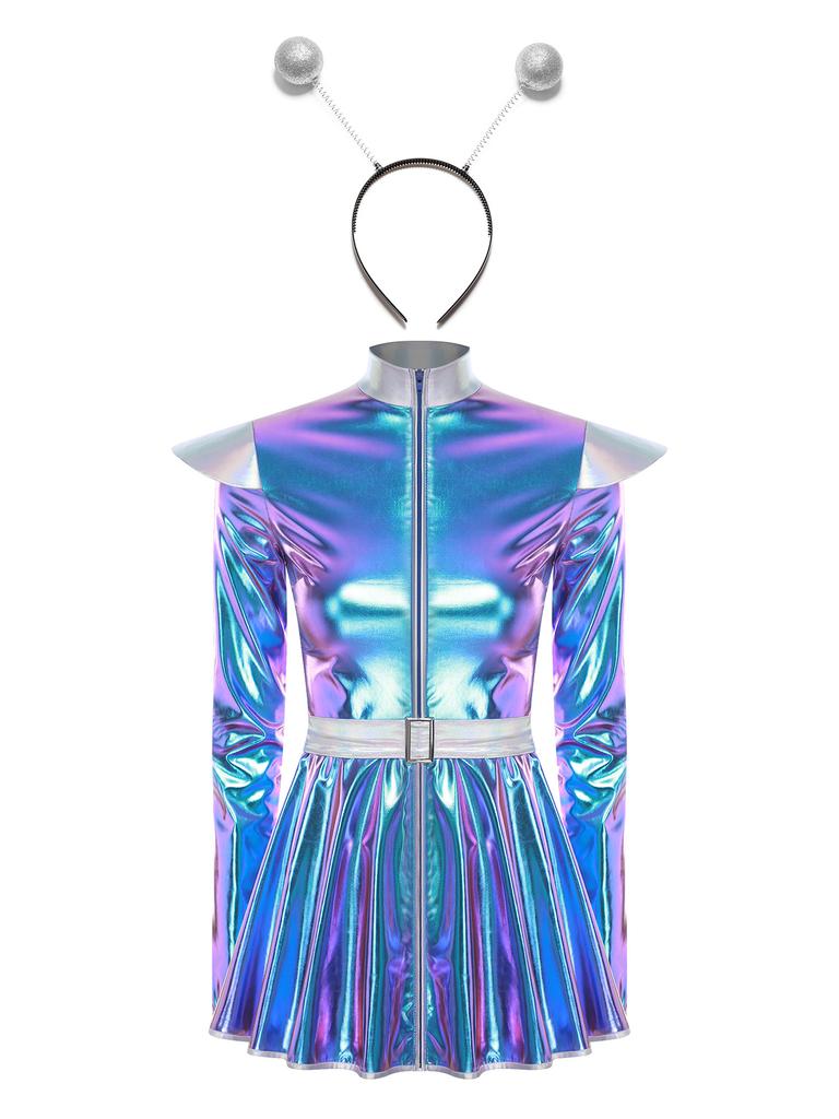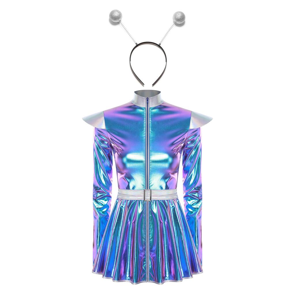 Женское платье для ролевых игр «Инопланетянка» S-XXL: Костюм астронавта на Хэллоуин, Металлический А-силуэт с обручем для волос и удобной передней молнией