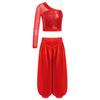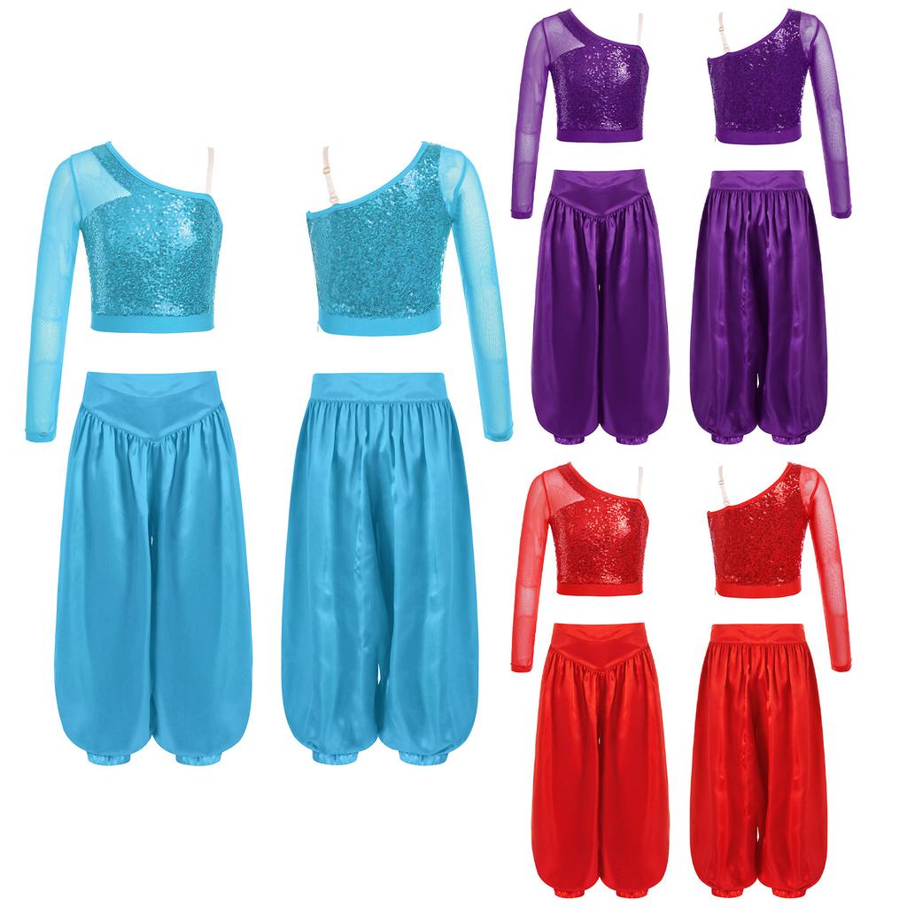 Комплект для танца живота для девочек: сетчатый топ с длинными рукавами и одним плечом, украшенный блестками и пайетками, укороченный топ, широкие атласные брюки-блумеры.