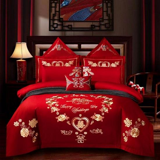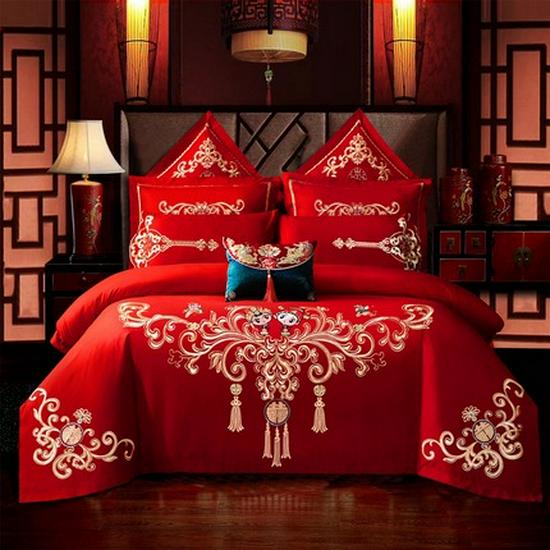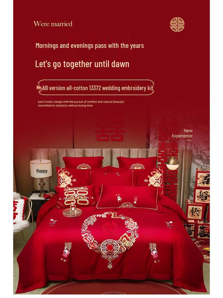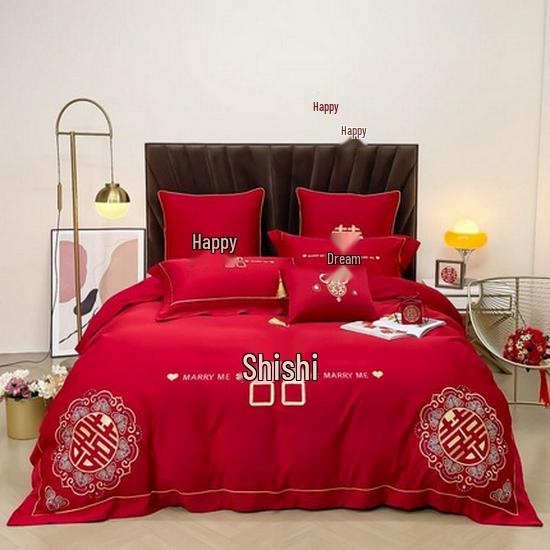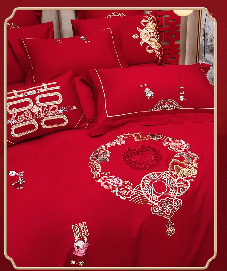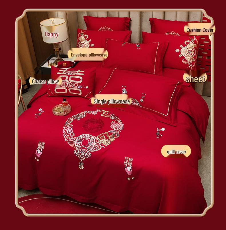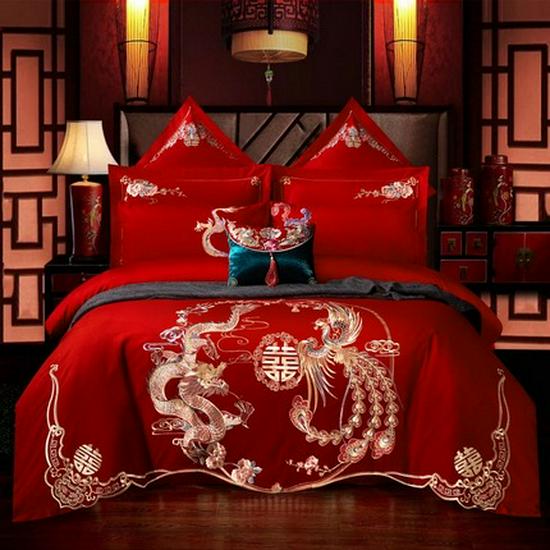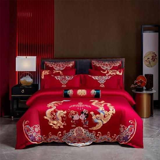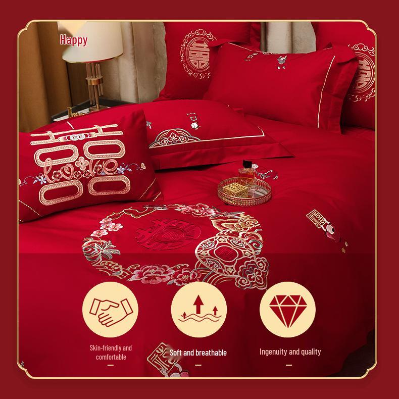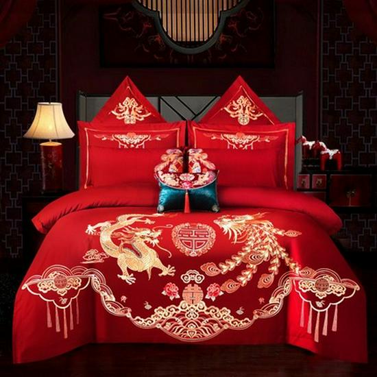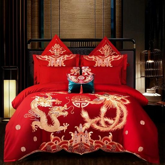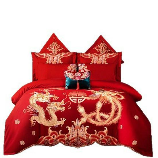 Luxury Dragon & Phoenix Embroidered Wedding Bedding Set - 4-Piece Festive Red Quilt for Newlyweds