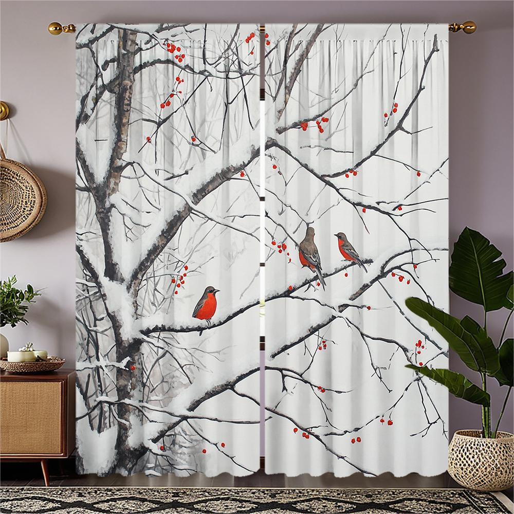 2-piece set of high-definition digital printed curtainwinter snow tree redbirds redberries rodcurtain styleHome decoration style