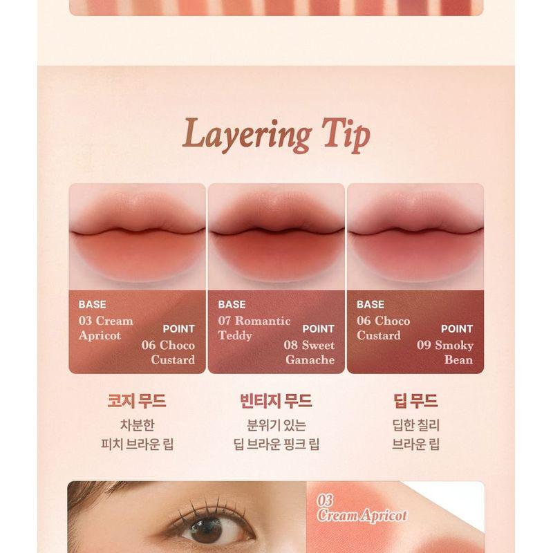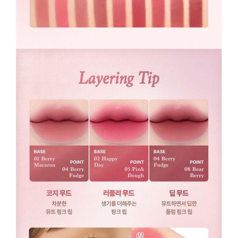 [#01 berry macaron] dimethicone, dimethicone crosspolymer, diphenylsiloxy phenyl trimethicone, dimethicone, caprylyl methicone, diisostearyl malate, titanium dioxide (ci 77891), tribehenin, hydrogenated polyisobutene, dimethicone, dimethicone/vinyl dimethicone crosspolymer, vinyl dimethicone/methicone silsesquioxane crosspolymer, silica, synthetic fluorphlogopite, polyglyceryl-2 triisostearate, dimethicone, disteardimonium hectorite, triethyl citrate, microcrystalline wax, sorbitan isostearate, polyhydroxystearic acid, lecithin, ethylhexyl palmitate, isostearic acid, isopropyl myristate, polyglyceryl-3 polyricinoleate, yellow 5 lake (ci 19140), iron oxides (ci 77491), red 28 lake (ci 45410), red 33 lake (ci 17200), red 7 lake (ci 15850), polyglyceryl-2 diisostearate, yellow 6 lake (ci 15985), paraffin, cera microcristallina (eu), fragrance(parfum), blue 1 lake (ci 42090), caprylyl glycol, glyceryl caprylate [#02 happy day] dimethicone, dimethicone crosspolymer, diphenylsiloxy phenyl trimethicone, dimethicone, caprylyl methicone, diisostearyl malate, titanium dioxide (ci 77891), tribehenin, hydrogenated polyisobutene, dimethicone, dimethicone/vinyl dimethicone crosspolymer, vinyl dimethicone/methicone silsesquioxane crosspolymer, silica, synthetic fluorphlogopite, polyglyceryl-2 triisostearate, dimethicone, disteardimonium hectorite, triethyl citrate, microcrystalline wax, sorbitan isostearate, polyhydroxystearic acid, lecithin, isostearic acid, ethylhexyl palmitate, isopropyl myristate, polyglyceryl-3 polyricinoleate, iron oxides (ci 77492), red 28 lake (ci 45410), red 7 lake (ci 15850), polyglyceryl-2 diisostearate, yellow 5 lake (ci 19140), paraffin, cera microcristallina (eu), fragrance(parfum), iron oxides (ci 77499), caprylyl glycol, glyceryl caprylate, blue 1 lake (ci 42090) [#03 tender fig] dimethicone, dimethicone crosspolymer, diphenylsiloxy phenyl trimethicone, dimethicone, caprylyl methicone, diisostearyl malate, titanium dioxide (ci 77891), tribehenin, hydrogenated polyisobutene, dimethicone, dimethicone/vinyl dimethicone crosspolymer, vinyl dimethicone/methicone silsesquioxane crosspolymer, silica, synthetic fluorphlogopite, polyglyceryl-2 triisostearate, dimethicone, disteardimonium hectorite, triethyl citrate, microcrystalline wax, iron oxides (ci 77491), sorbitan isostearate, polyhydroxystearic acid, lecithin, isostearic acid, isopropyl myristate, ethylhexyl palmitate, polyglyceryl-3 polyricinoleate, iron oxides (ci 77492), red 7 lake (ci 15850), polyglyceryl-2 diisostearate, blue 1 lake (ci 42090), paraffin, cera microcristallina (eu), fragrance(parfum), caprylyl glycol, glyceryl caprylate [#04 berry fudge] dimethicone, dimethicone crosspolymer, diphenylsiloxy phenyl trimethicone, dimethicone, caprylyl methicone, diisostearyl malate, tribehenin, hydrogenated polyisobutene, dimethicone, dimethicone/vinyl dimethicone crosspolymer, titanium dioxide (ci 77891), polyglyceryl-2 triisostearate, vinyl dimethicone/methicone silsesquioxane crosspolymer, silica, synthetic fluorphlogopite, dimethicone, disteardimonium hectorite, triethyl citrate, microcrystalline wax, iron oxides (ci 77491), sorbitan isostearate, polyhydroxystearic acid, lecithin, isostearic acid, isopropyl myristate, ethylhexyl palmitate, polyglyceryl-3 polyricinoleate, yellow 5 lake (ci 19140), red 33 lake (ci 17200), red 7 lake (ci 15850), polyglyceryl-2 diisostearate, paraffin, cera microcristallina (eu), fragrance(parfum), blue 1 lake (ci 42090), caprylyl glycol, glyceryl caprylate [#05 pink dough] dimethicone, dimethicone crosspolymer, diphenylsiloxy phenyl trimethicone, dimethicone, caprylyl methicone, diisostearyl malate, tribehenin, hydrogenated polyisobutene, dimethicone, dimethicone/vinyl dimethicone crosspolymer, titanium dioxide (ci 77891), vinyl dimethicone/methicone silsesquioxane crosspolymer, silica, synthetic fluorphlogopite, polyglyceryl-2 triisostearate, dimethicone, disteardimonium hectorite, triethyl citrate, red 7 lake (ci 15850), yellow 5 lake (ci 19140), microcrystalline wax, polyglyceryl-2 diisostearate, sorbitan isostearate, polyhydroxystearic acid, lecithin, ethylhexyl palmitate, isostearic acid, isopropyl myristate, polyglyceryl-3 polyricinoleate, iron oxides (ci 77492), paraffin, cera microcristallina (eu), blue 1 lake (ci 42090), fragrance(parfum), caprylyl glycol, glyceryl caprylate [#06 pink crush] dimethicone, dimethicone crosspolymer, diphenylsiloxy phenyl trimethicone, dimethicone, caprylyl methicone, tribehenin, hydrogenated polyisobutene, dimethicone, dimethicone/vinyl dimethicone crosspolymer, diisostearyl malate, polyglyceryl-2 triisostearate, vinyl dimethicone/methicone silsesquioxane crosspolymer, silica, synthetic fluorphlogopite, red 7 lake (ci 15850), dimethicone, disteardimonium hectorite, triethyl citrate, polyglyceryl-2 diisostearate, red 28 lake (ci 45410), microcrystalline wax, titanium dioxide (ci 77891), red 33 lake (ci 17200), sorbitan isostearate, polyhydroxystearic acid, lecithin, ethylhexyl palmitate, isostearic acid, isopropyl myristate, polyglyceryl-3 polyricinoleate, yellow 5 lake (ci 19140), red 6 (ci 15850), paraffin, cera microcristallina (eu), fragrance(parfum), caprylyl glycol, glyceryl caprylate [#07 dipping cherry] dimethicone, dimethicone crosspolymer, diphenylsiloxy phenyl trimethicone, dimethicone, caprylyl methicone, tribehenin, hydrogenated polyisobutene, dimethicone, dimethicone/vinyl dimethicone crosspolymer, diisostearyl malate, vinyl dimethicone/methicone silsesquioxane crosspolymer, silica, titanium dioxide (ci 77891), polyglyceryl-2 triisostearate, synthetic fluorphlogopite, dimethicone, disteardimonium hectorite, triethyl citrate, microcrystalline wax, sorbitan isostearate, polyhydroxystearic acid, lecithin, isostearic acid, ethylhexyl palmitate, isopropyl myristate, polyglyceryl-3 polyricinoleate, red 7 lake (ci 15850), iron oxides (ci 77492), polyglyceryl-2 diisostearate, yellow 5 lake (ci 19140), red 33 lake (ci 17200), iron oxides (ci 