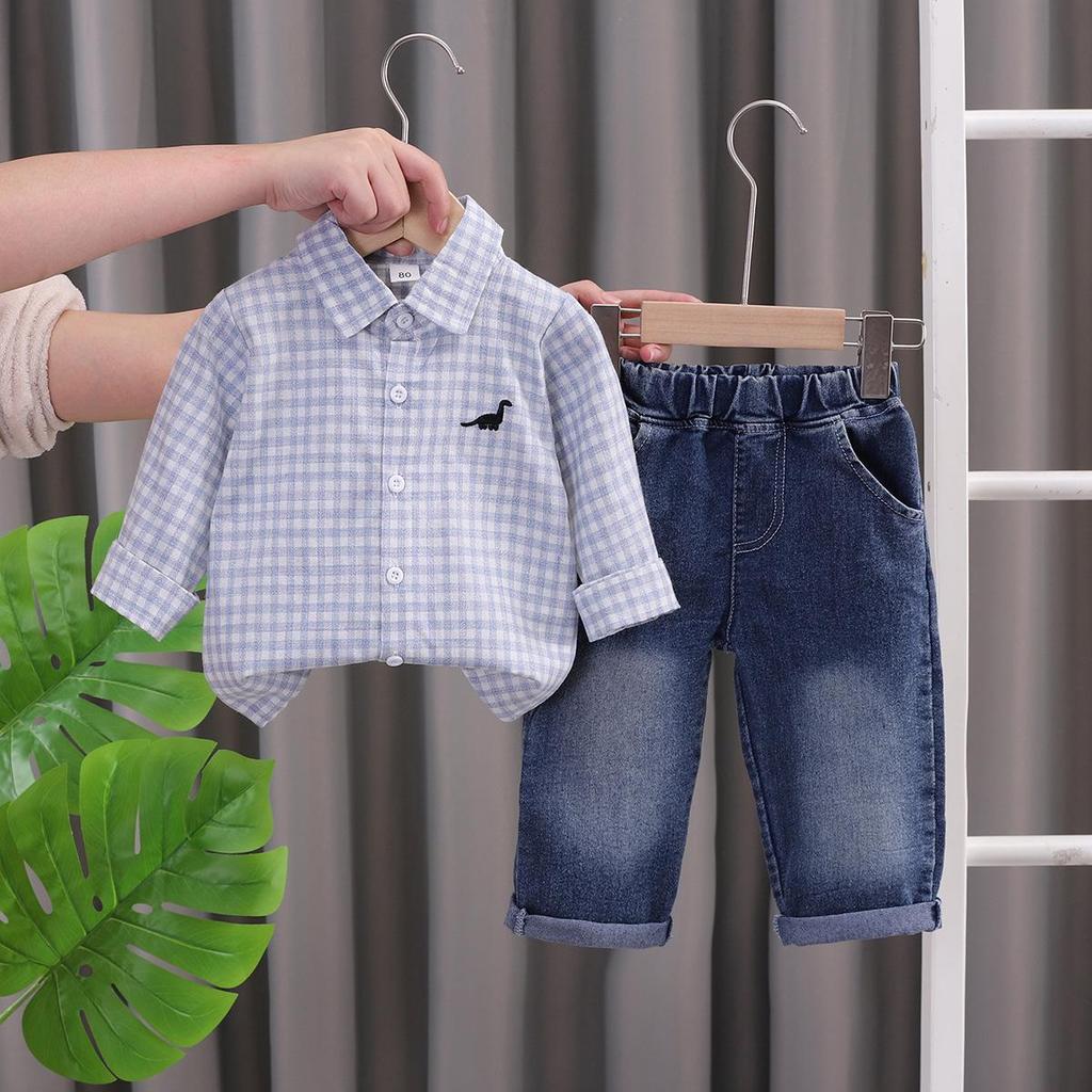 2025 Spring/Autumn Cute Boys' Plaid Shirt & Jeans Set