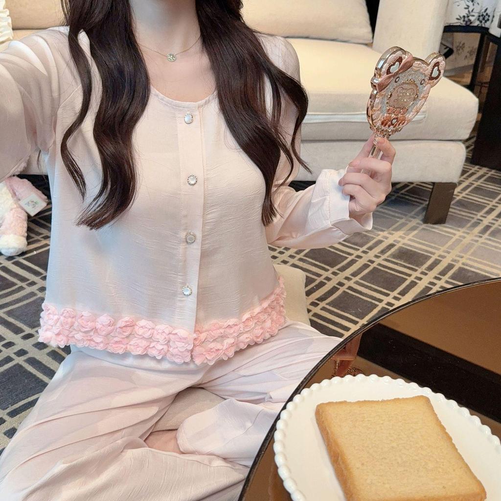Женский розовый шелковый пижамный комплект с цветочным принтом для осени/зимы - Милый, очаровательный и подходит для улицы. — купить товар онлайн с бесплатной доставкой по всему миру!