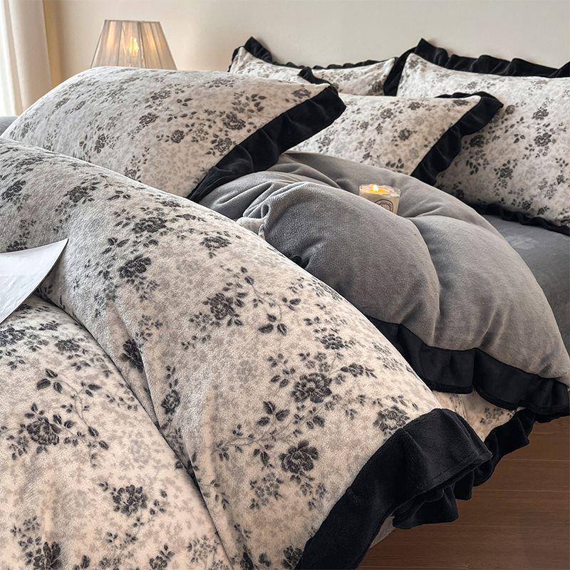 G5Z Постельное белье из молочного велюра и кружева: Утолщенный четырехсекционный комплект из фланели и кораллового флиса, двусторонний, с пододеяльником.