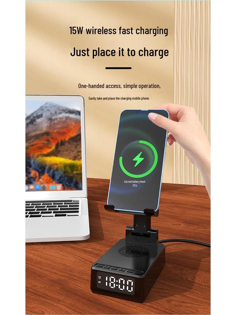 Portable Multifunction Wireless Charging Alarm Clock with Bluetooth Speaker & Phone Stand