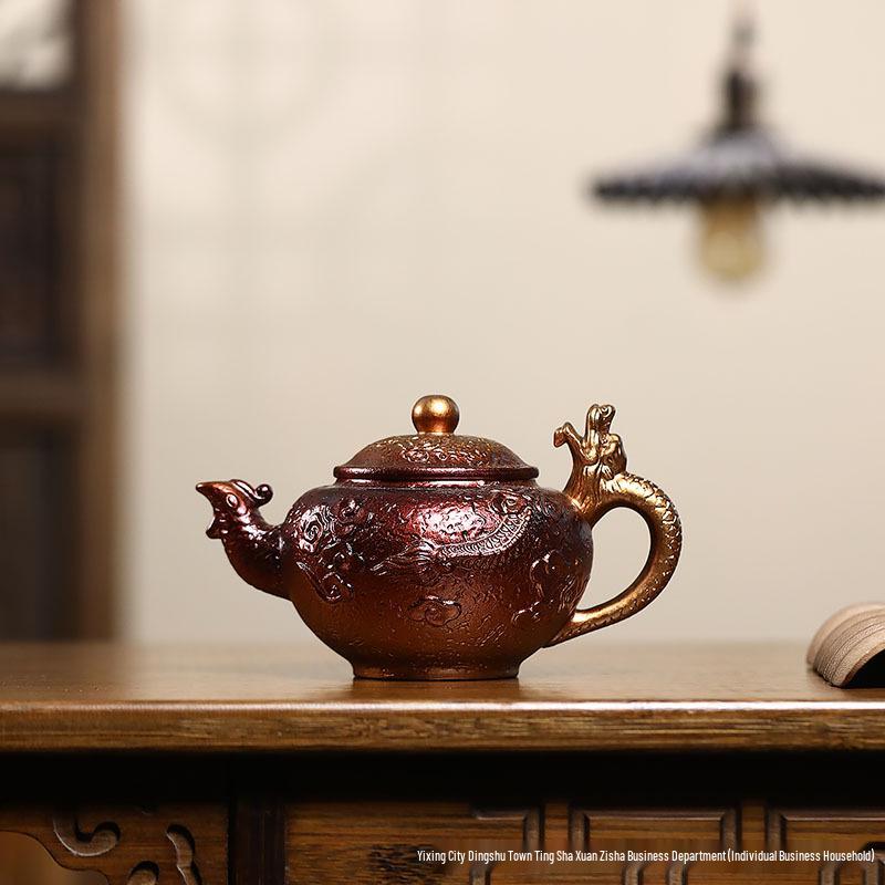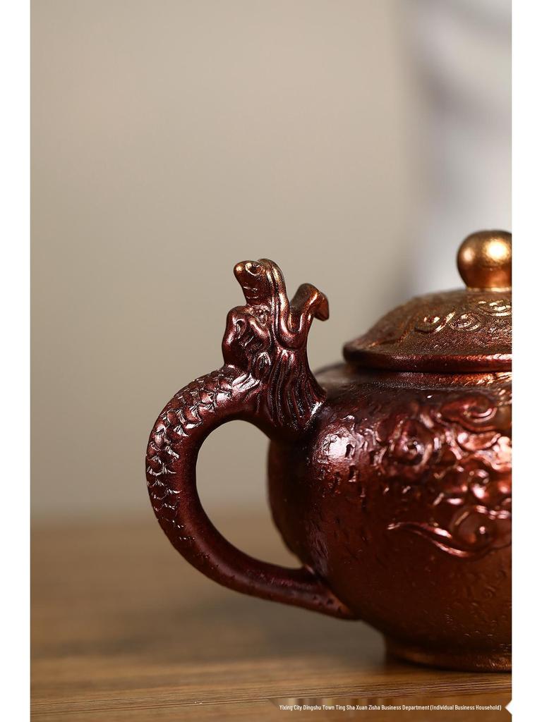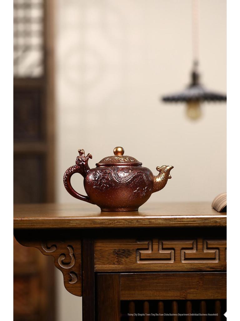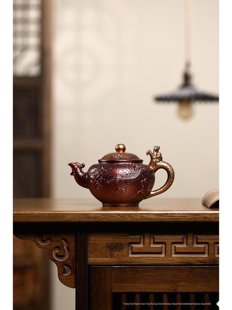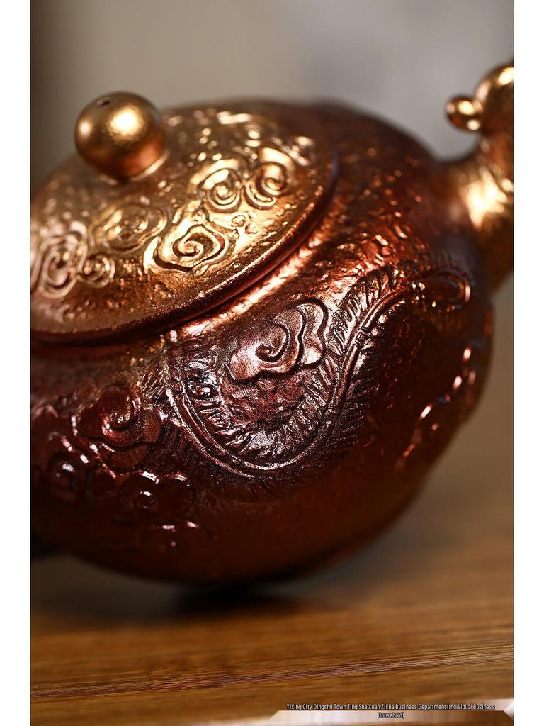 Yixing Artisan Handmade Jinbei Red Stoneware Floral Teapot with Secret Pattern
