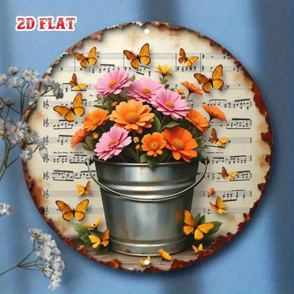 Metal Wall Art Music Note Sign Rustic Farmhouse Decor Tin Round Orange Pink Flowers Antique Sheet Music