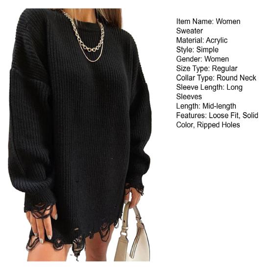 Женский свитер Трехмерный крой Свободная посадка Мягкий вязаный свитер Круглый вырез Длинный рукав Рваные дыры Средней длины Топы