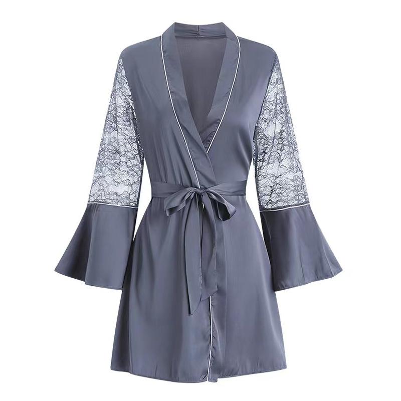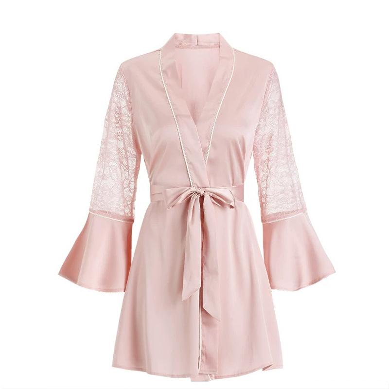 Халат с расклешенными рукавами Короткий кимоно-халат Сексуальный халат с кружевными рукавами Атласная одежда для сна Женский халат