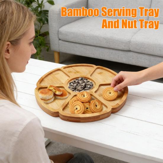 Это элегантное блюдо диаметром 9 дюймов имеет семь отдельных секций в форме лепестков, идеально подходящих для стильной и организованной подачи закусок, фруктов, соусов, орехов или мясной нарезки.. Изготовленный вручную из 100% натурального бамбука, он обеспечивает прочность и экологичность, а также украсит любую сервировку стола своей гладкой поверхностью и насыщенной текстурой..