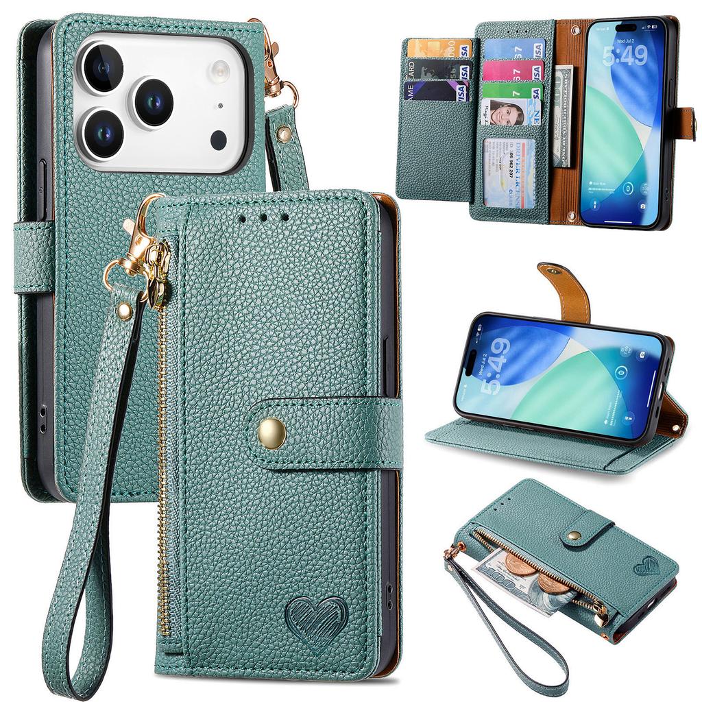 For iPhone 17 Pro Max Case RFID Blocking Zipper Pocket Leather Wallet Phone Cover with Strap