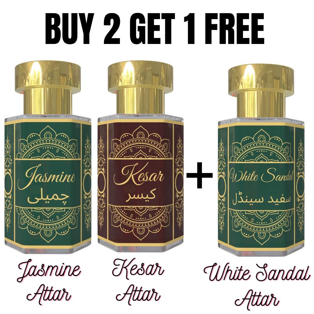 Аттар Кесар и Аттар Жасмина с бесплатным Аттаром Белого Сандала – Цветочный и Мягкий Древесный Аромат | Без Алкоголя | 3 x 6 мл