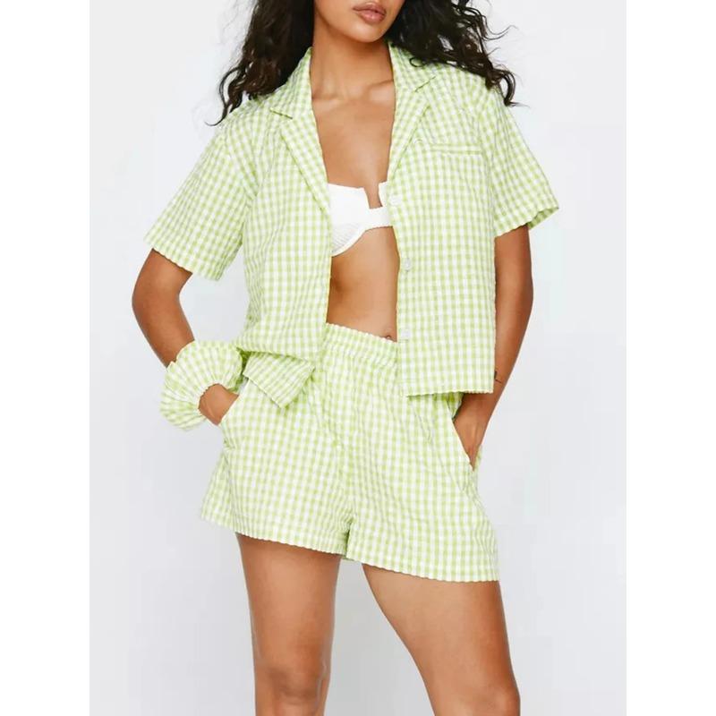 Новый комплект из шорт в клеточку, женский комплект из 2 предметов для отдыха, рубашка в клетку с коротким рукавом и лацканами, топы и шорты, комплекты одежды для сна