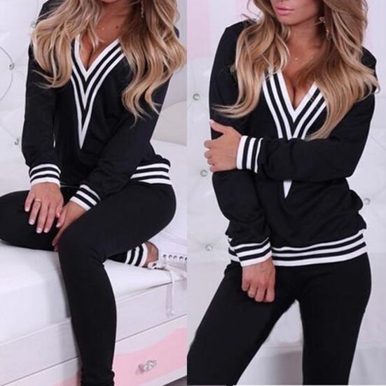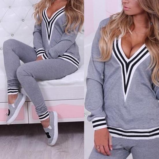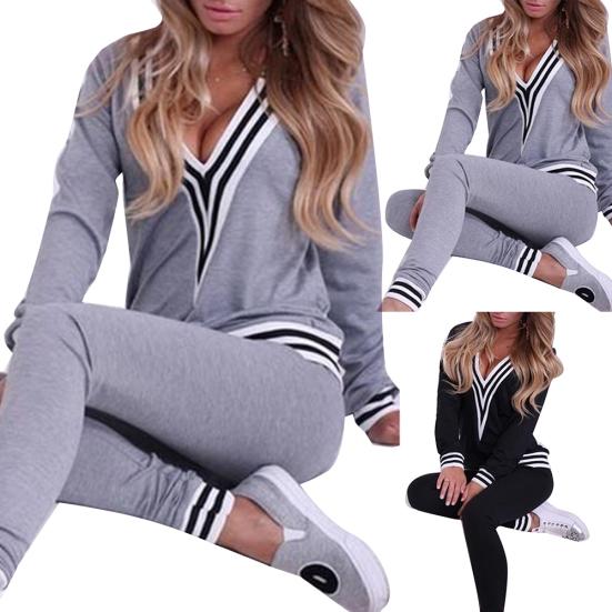 2 шт./компл. женские повседневные полосатые подол с v-образным вырезом толстовка брюки хлопок спортивный спортивный костюм