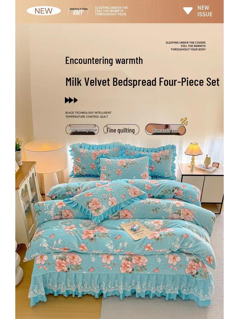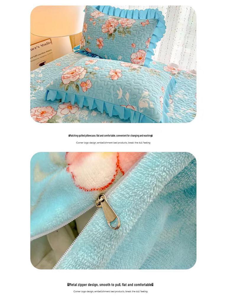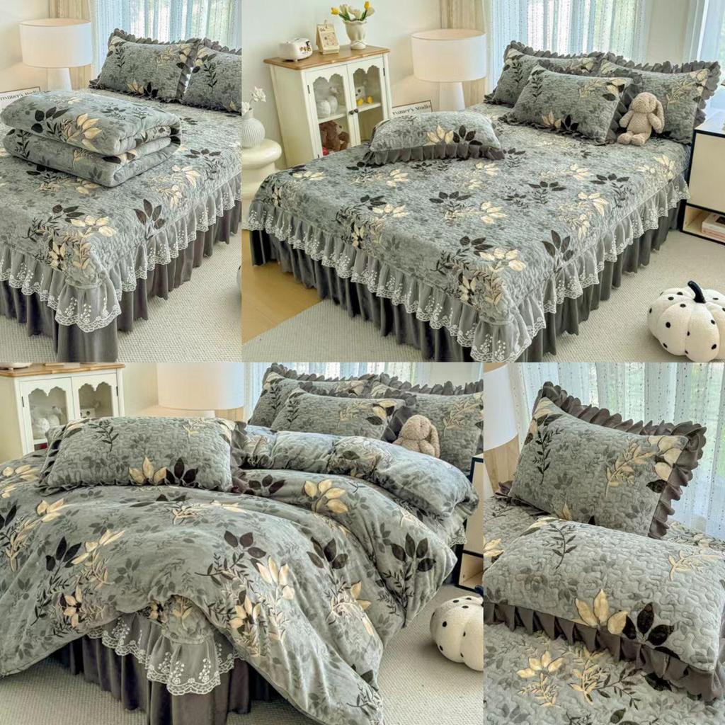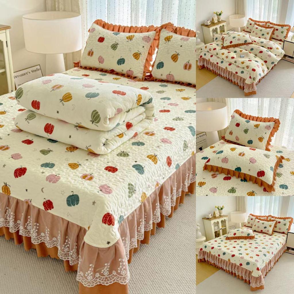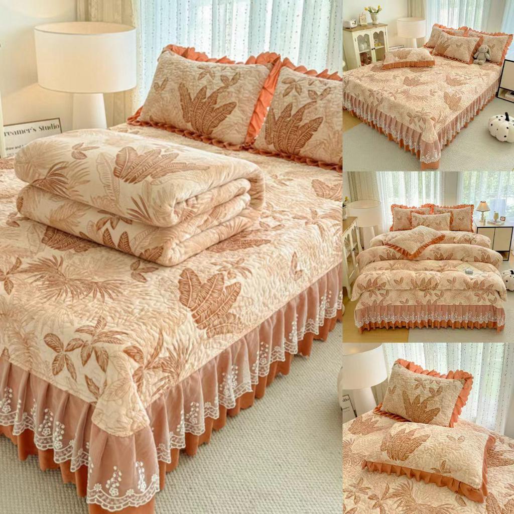 Утолщенный стеганый бархатный комплект покрывала с кружевными наволочками и тепловым контролем с защитой от статического электричества