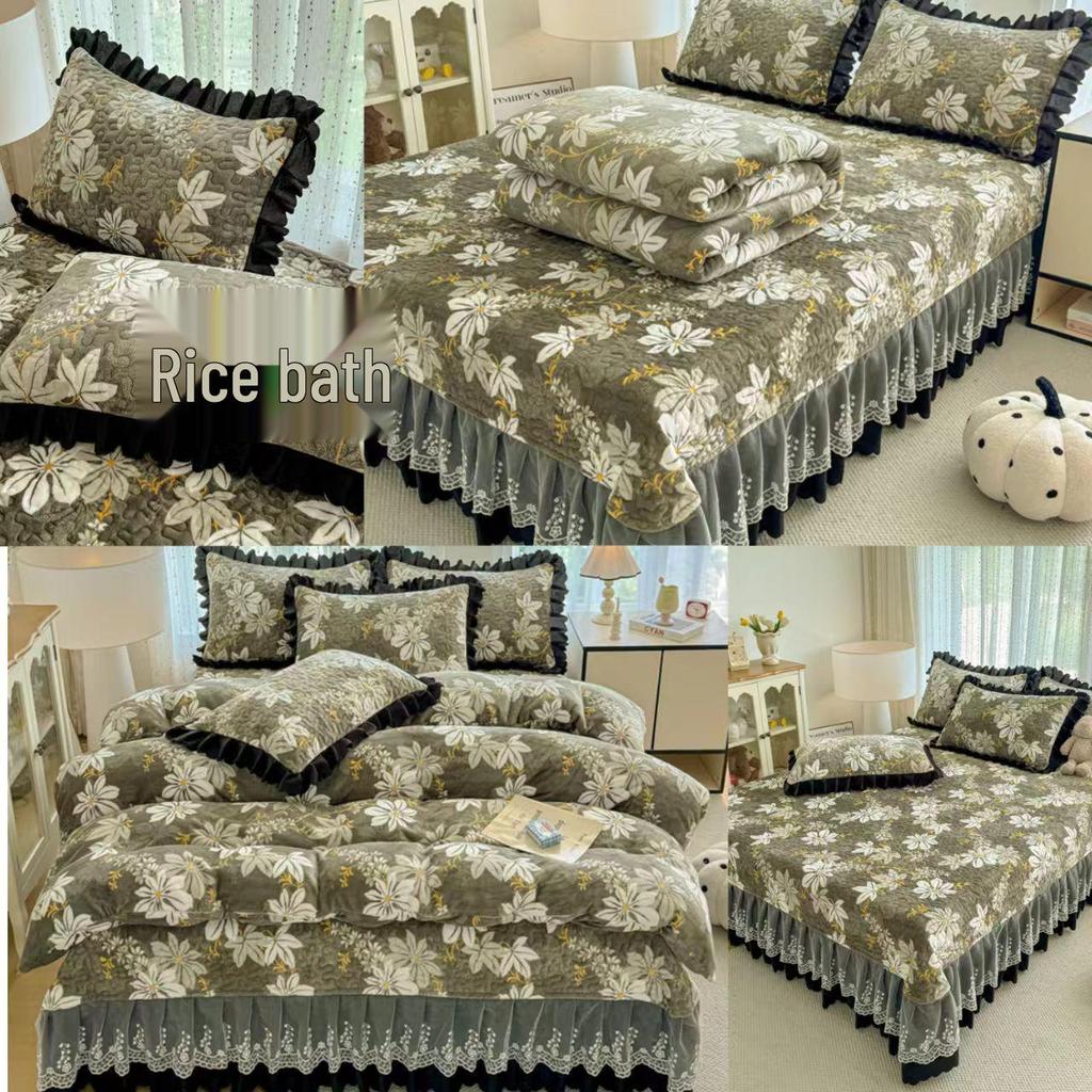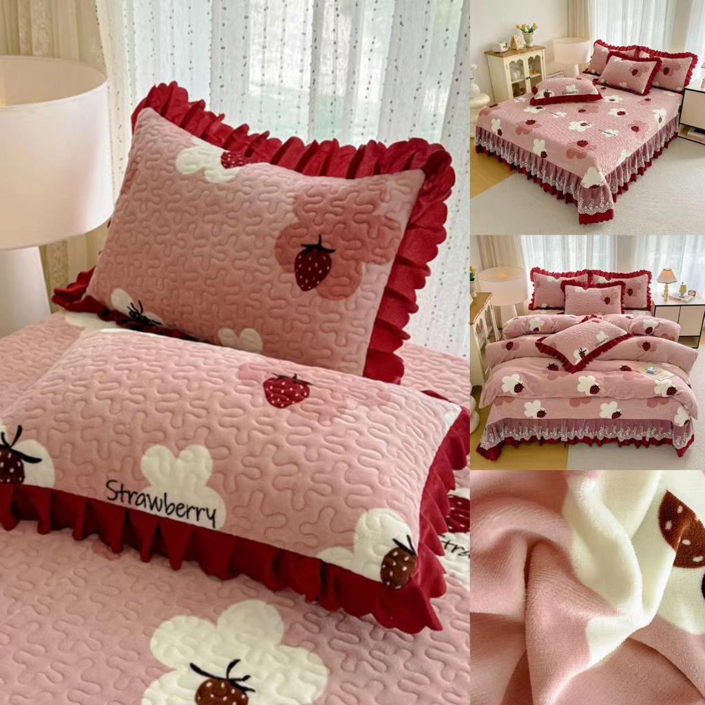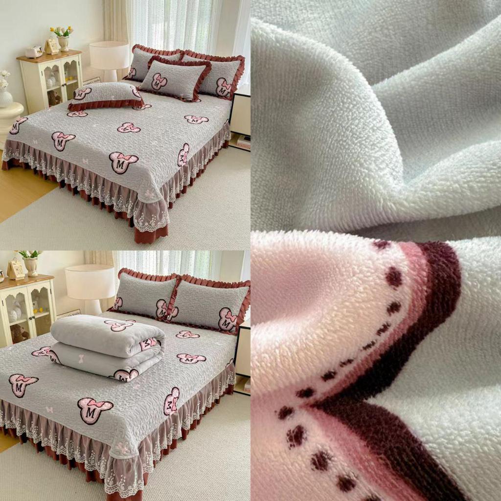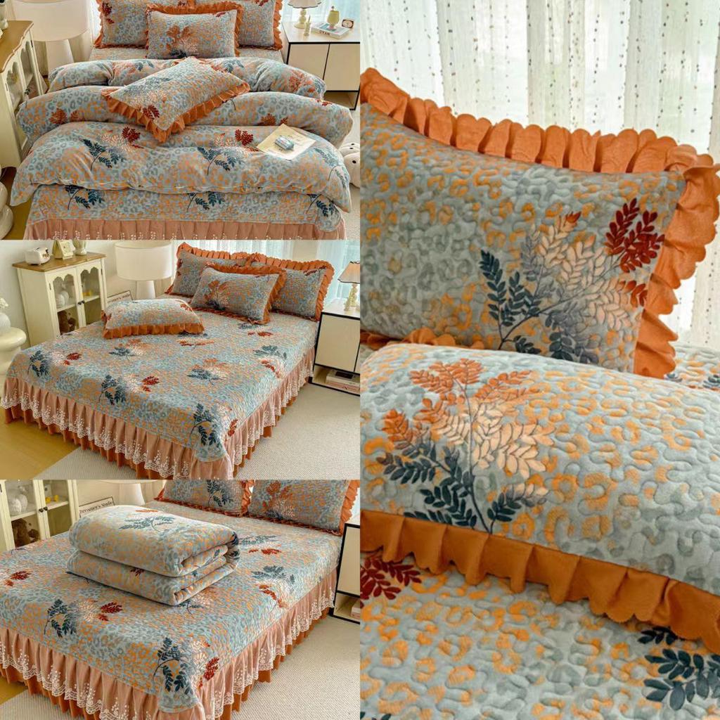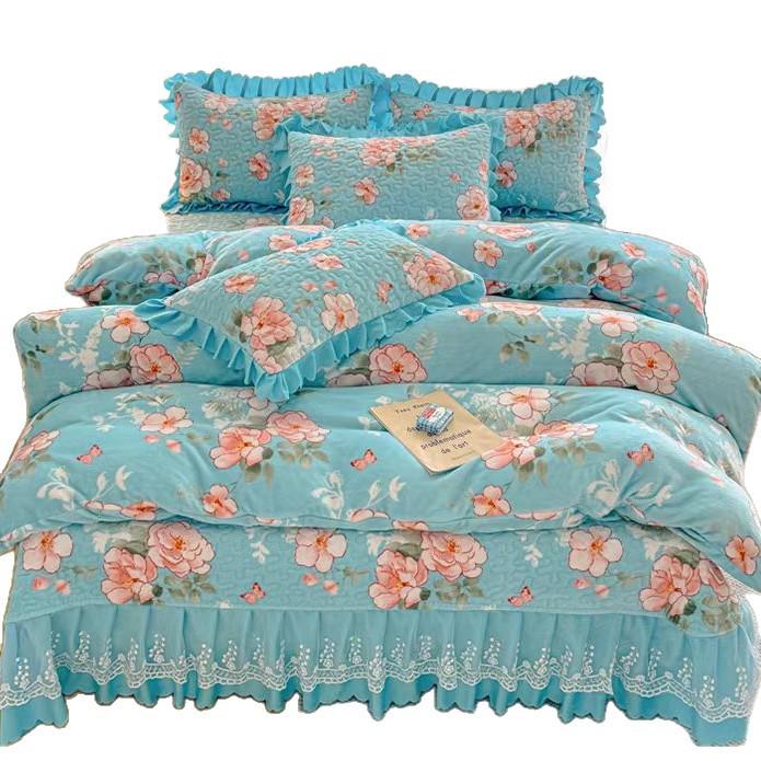 Утолщенный стеганый бархатный комплект покрывала с кружевными наволочками и тепловым контролем с защитой от статического электричества