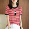 Полосатая вышитая футболка с круглым вырезом из мерсеризованного хлопка для женщин, летний топ с короткими рукавами, вязаный свитер с контрастной хлопковой нитью