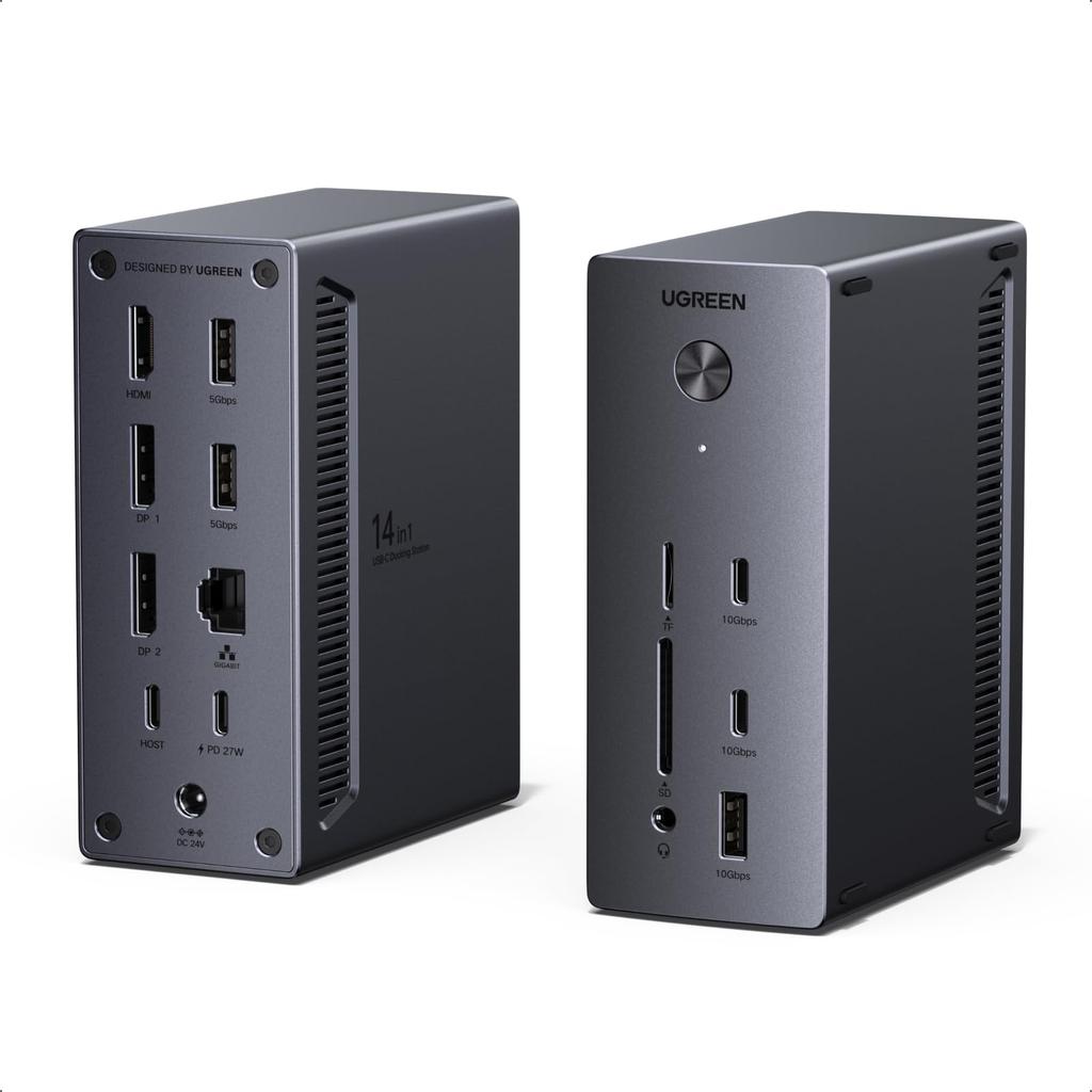 UGREEN Док-станция 14-в-1 с тройным выводом на дисплей, зарядкой ноутбука 100 Вт, двойным DP и HDMI (DP-4K120Hz, HDMI-4K60Hz), Высокоскоростная передача 10 Гбит/с, PD3.0, порты USB-C/A3.2, 3,5 мм аудио, слот для карт SD/TF, порт Ethernet RJ45, рассеивание тепла, совместимость с MacBook и Windows