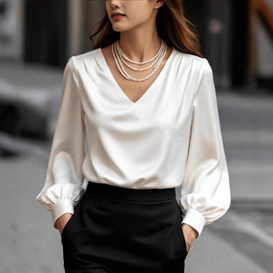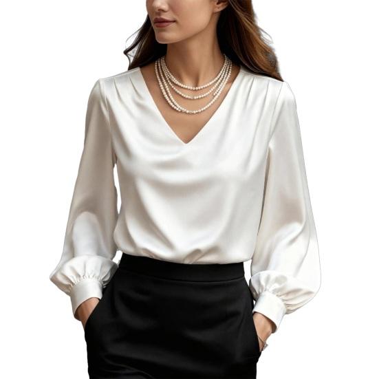 Стильный V-образный вырез и рукава-буфы: Эта блузка, разработанная с V-образным вырезом, подчеркивающим фигуру, и модными рукавами-буфами, сочетает в себе классическую элегантность и современный стиль.. Рукава естественно драпируются и их можно легко подкатать для создания различных стилей.