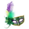 Яркий дизайн с перьями: Эта маска для вечеринки украшена пушистыми перьями желтого, зеленого и фиолетового цветов, которые добавляют живое движение и нотку элегантности.. Динамичное расположение перьев усиливает общую визуальную привлекательность, делая его идеальным для праздничных случаев и создавая яркое присутствие.