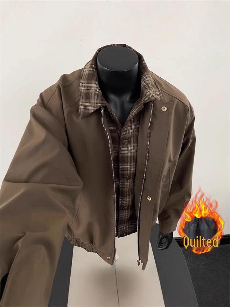 American Streetwear Trendy Patchwork Color Block Couple Autumn Padded Lapel Jacket