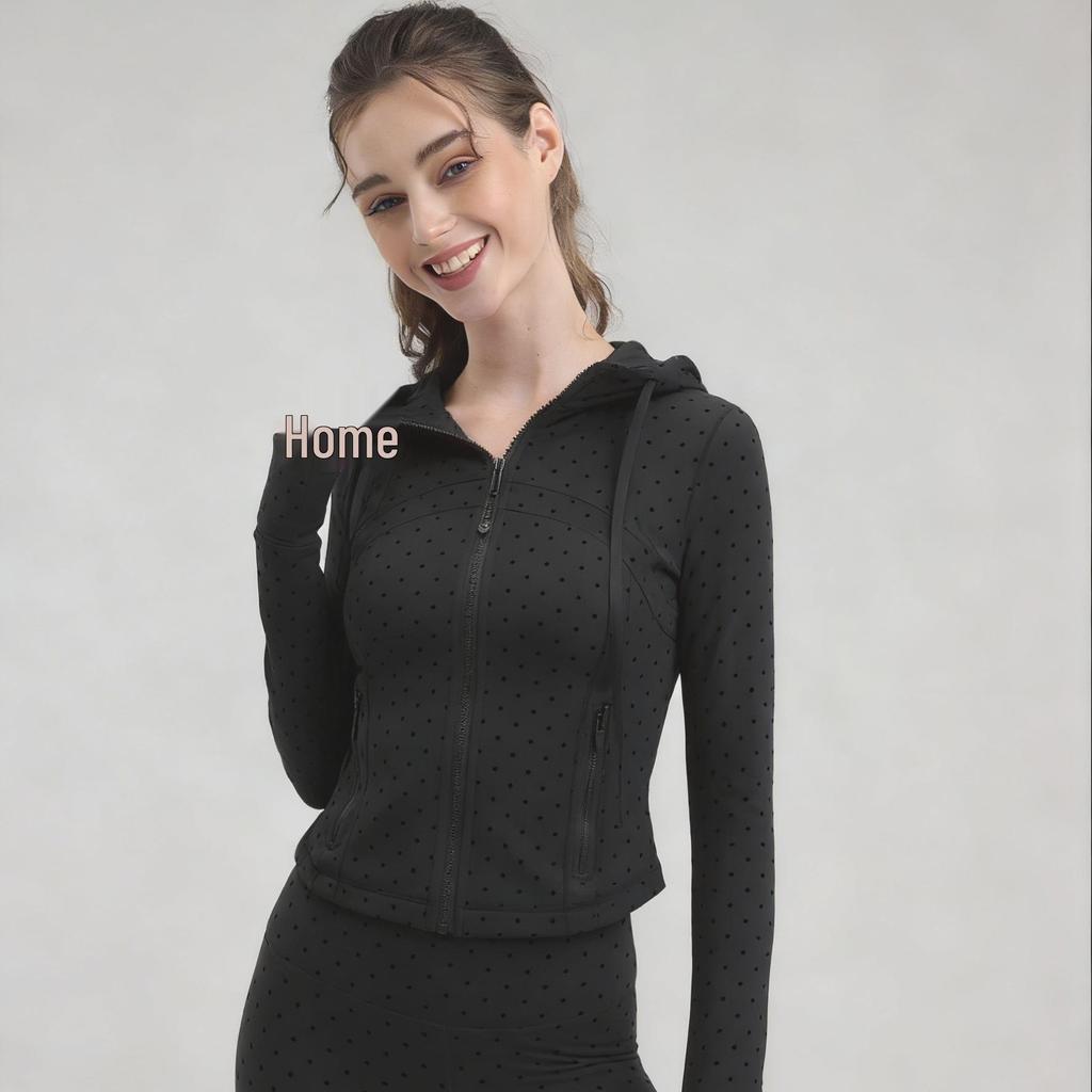 Women's Polka Dot Flocked Hooded Yoga Jacket - Long Sleeve Zip-Up Fitness Top