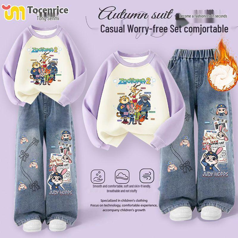 Комплект из двух предметов для девочек: Худи и Широкие Джинсы Zootopia 2, С начесом, Осень/Зима