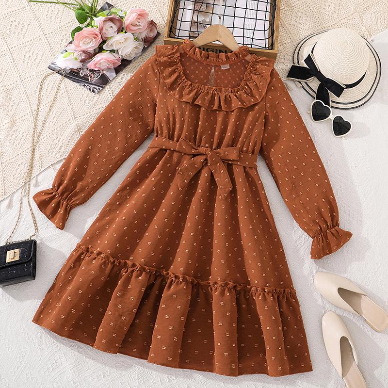 Girls' Long Sleeve Princess Dress with Pom-pom Lace Trim and Cinched Waist - Autumn/Winter Collection — купить товар онлайн с бесплатной доставкой по всему миру!