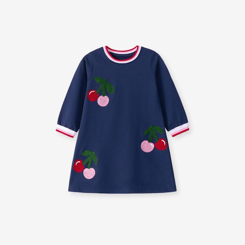 Платье для девочек Весна и Осень 2025 Новое Стильное Детское Темно-синее с Вишнями Средней Длины Повседневное Худи-Платье — купить товар онлайн с бесплатной доставкой по всему миру!