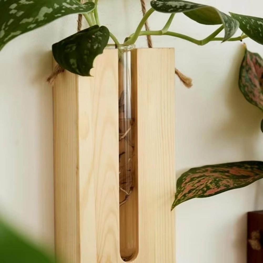 Wooden Flower Planters Hanging Bohemia Style Flower Tube Vase with Wood Stand Hydroponic Plant Rack
