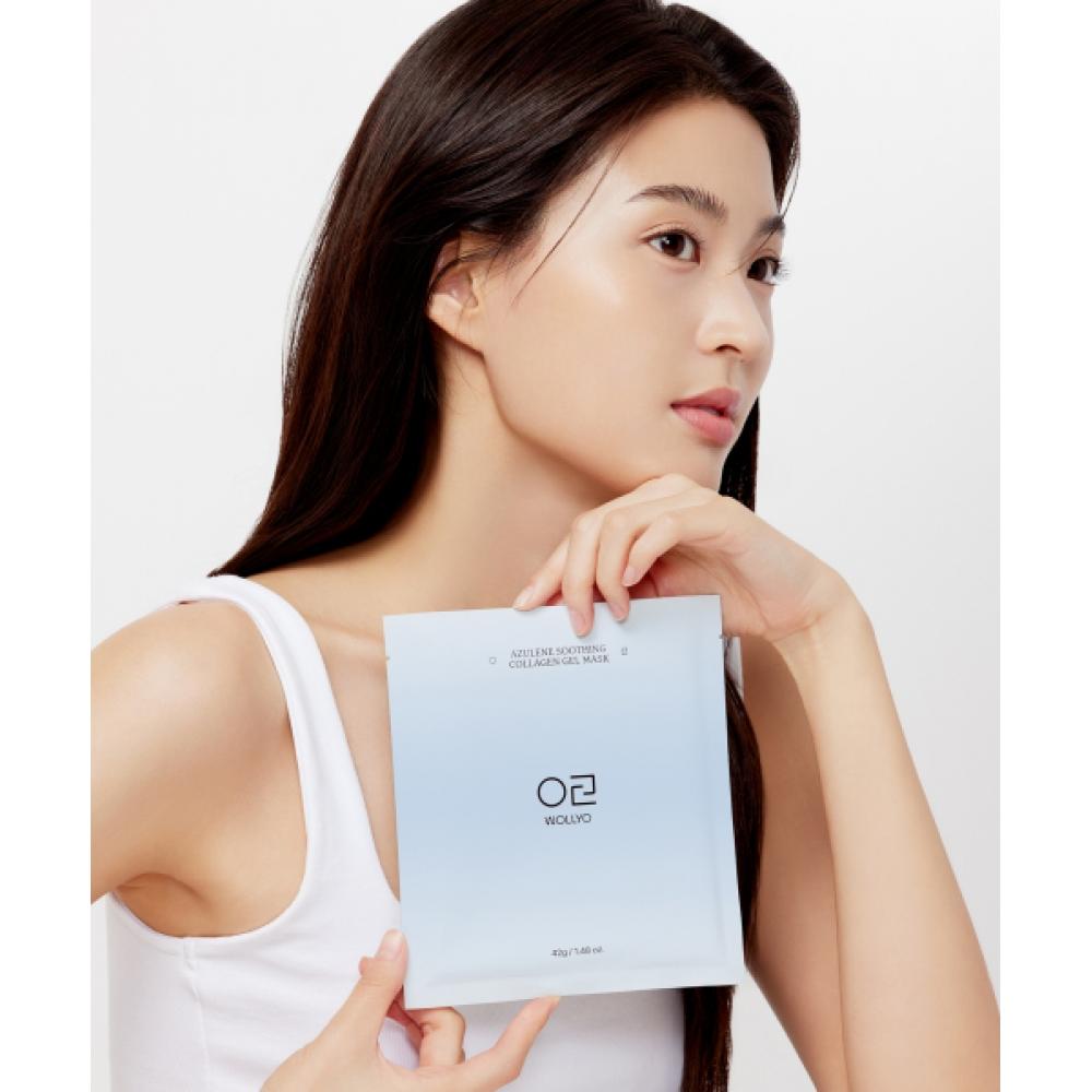 WOLLYO Azulene Soothing Collagen Hydrogel Mask 42g 5 Sheets is a hydrogel mask with high-concentration azulene ingredients that provide intensive soothing care for sensitive skin. It contains vegan collagen and various moisturizing and elasticizing ingredients that help keep the skin hydrated and firm. The mask is optimized to provide immediate hydration and calming effects, acting as an 'SOS soothing pack' in times of irritation.