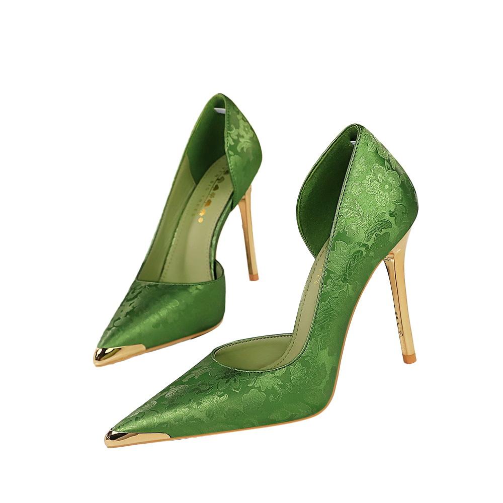 Banquet National Style Women's Shoes High Heels Thin Heel Shallow Mouth Side Hollow Satin Metal Pointed Single Shoes