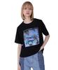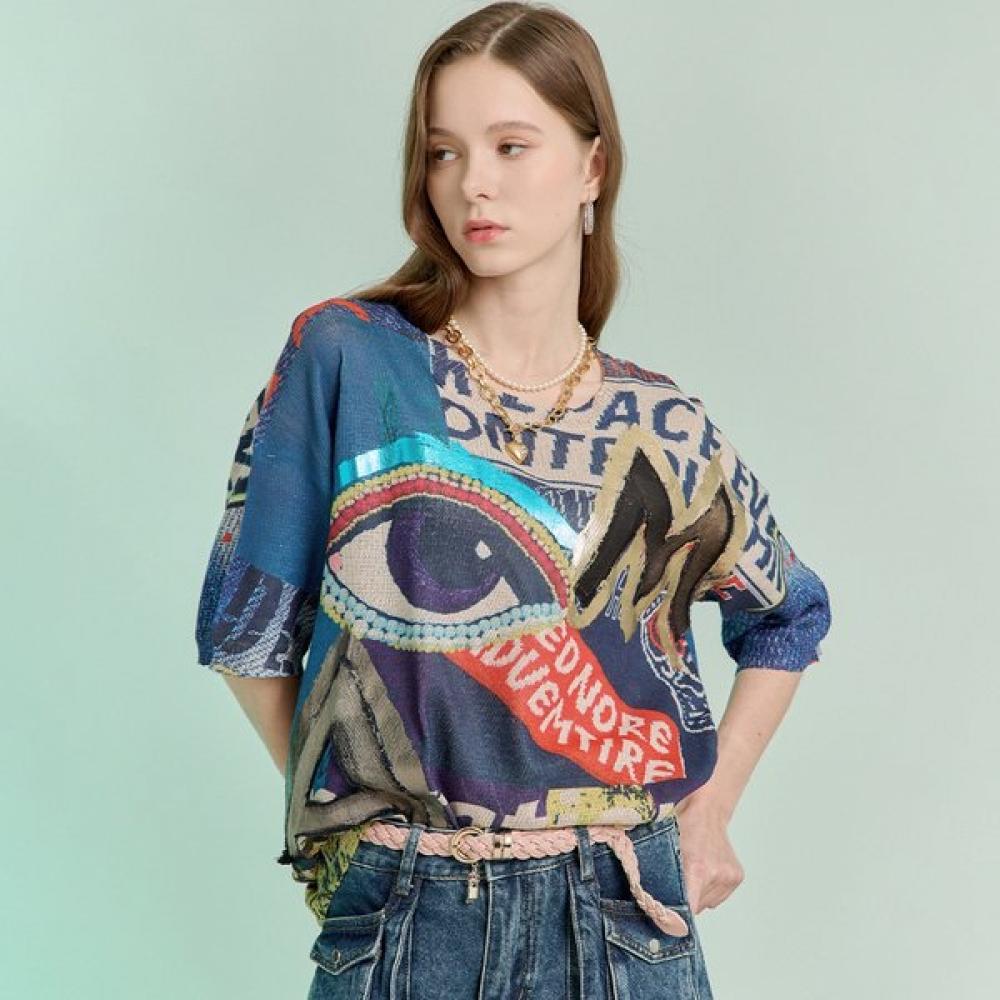 The Pop Art Lettering Printing Loose Fit Round Short Sleeve Knit by MAJA features a glossy pop art print and a unique mood reminiscent of marker artwork.