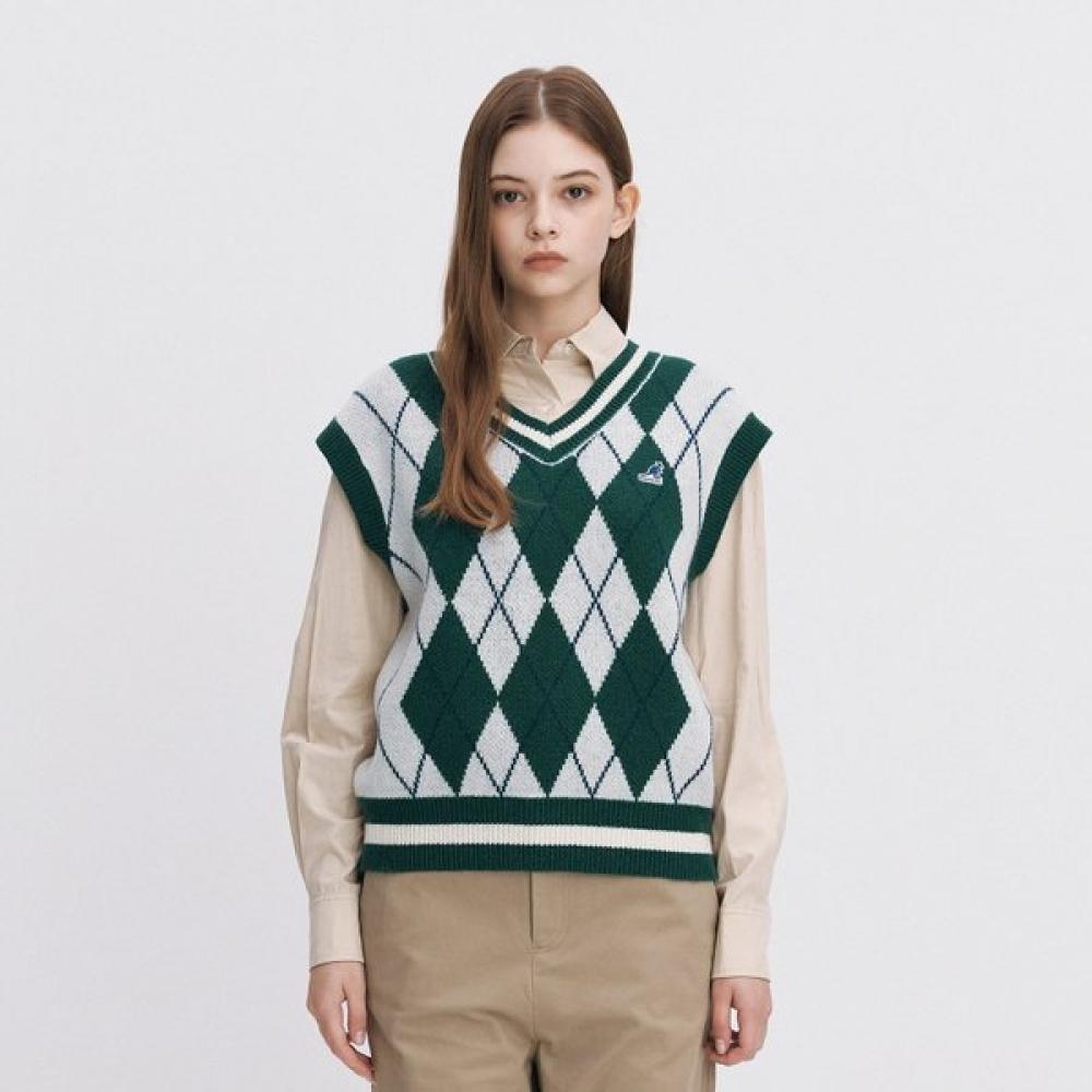 Вязаный жилет KANGOL Argyle 1877 Зеленый имеет оригинальный узор «аргил» и V-образный вырез.. Этот жилет легко надеть как часть повседневного образа и можно сочетать с различными нарядами.. Кроме того, базовая посадка силуэта обеспечивает комфорт.