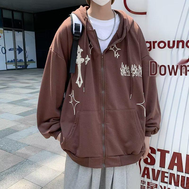 Мужской кардиган-толстовка на молнии с капюшоном, вышивкой креста и пламени, с флисовой подкладкой, модный свободный крой для пар, идеально подходит для весны и осени.