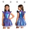 Костюм инопланетянина для девочки на сцену: Блестящее платье с воротником-стойкой, юбкой-пачкой с оборками и летящими рукавами, в комплекте с обручем для волос