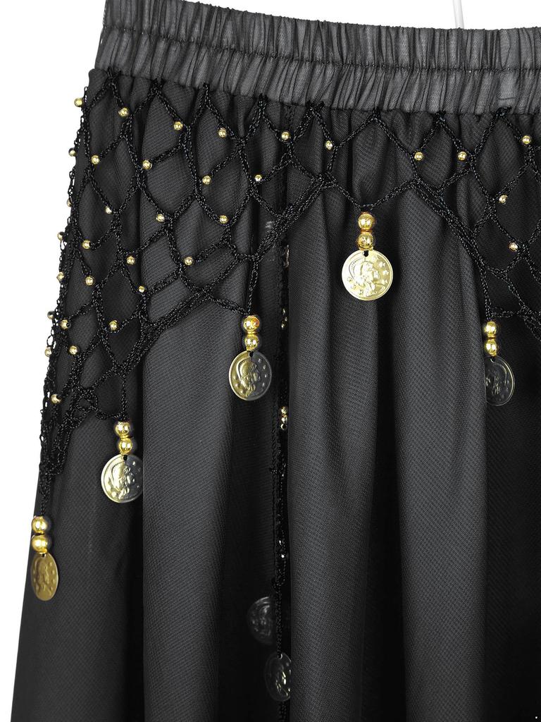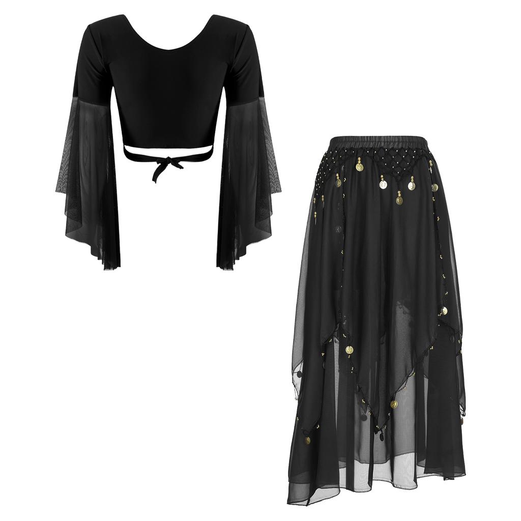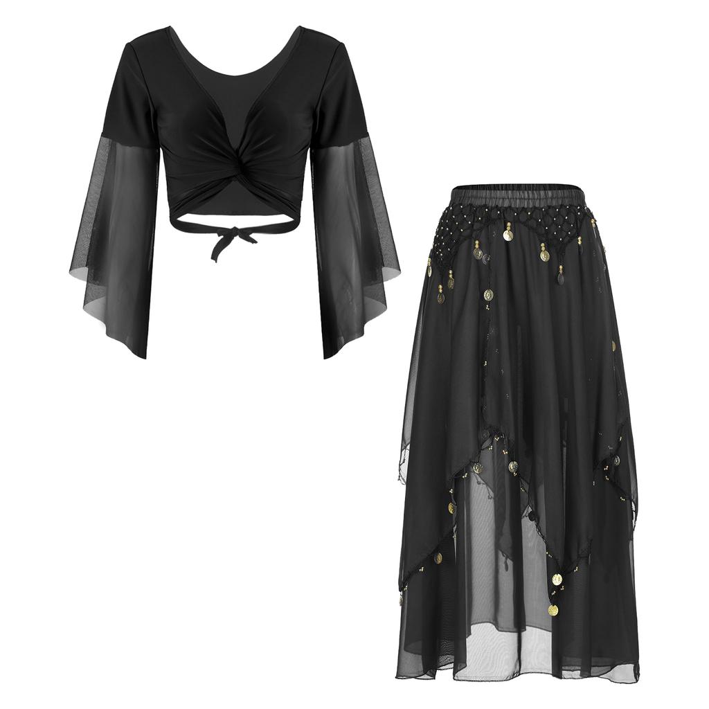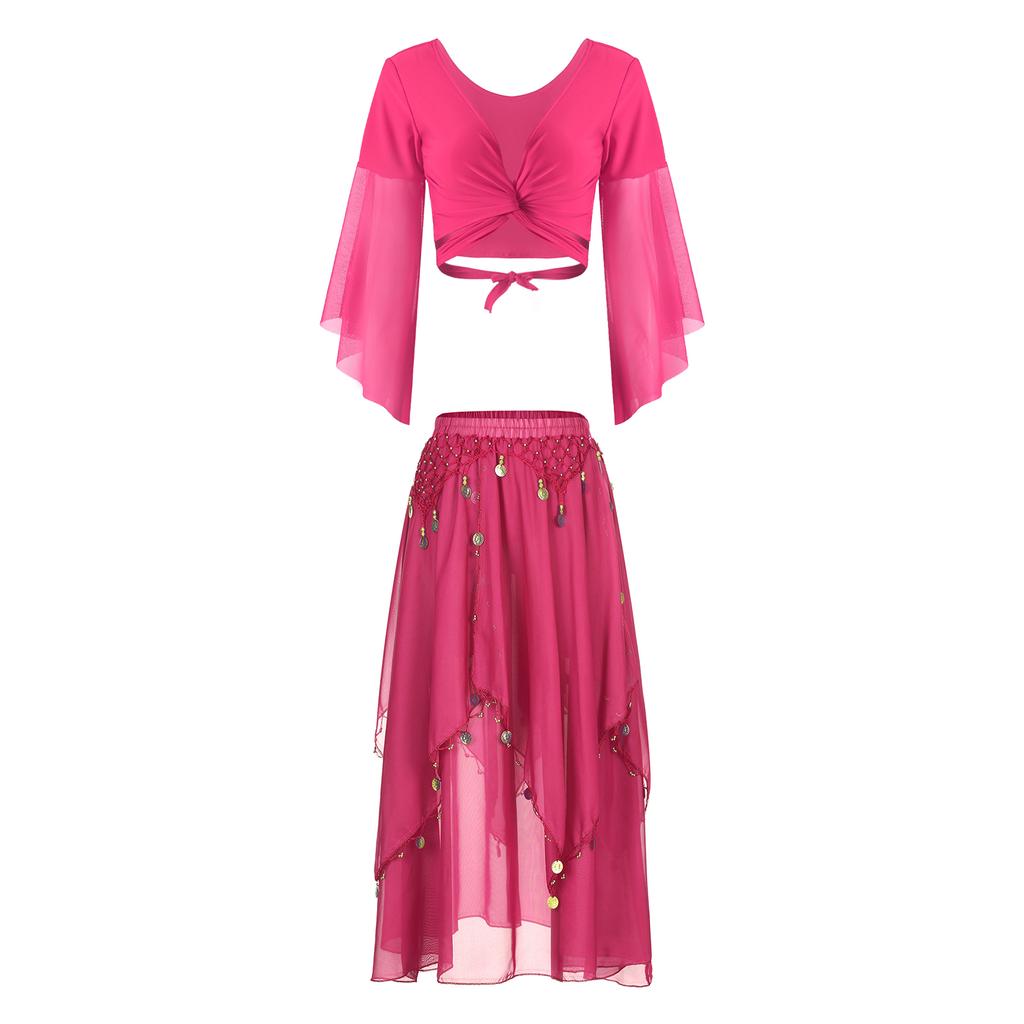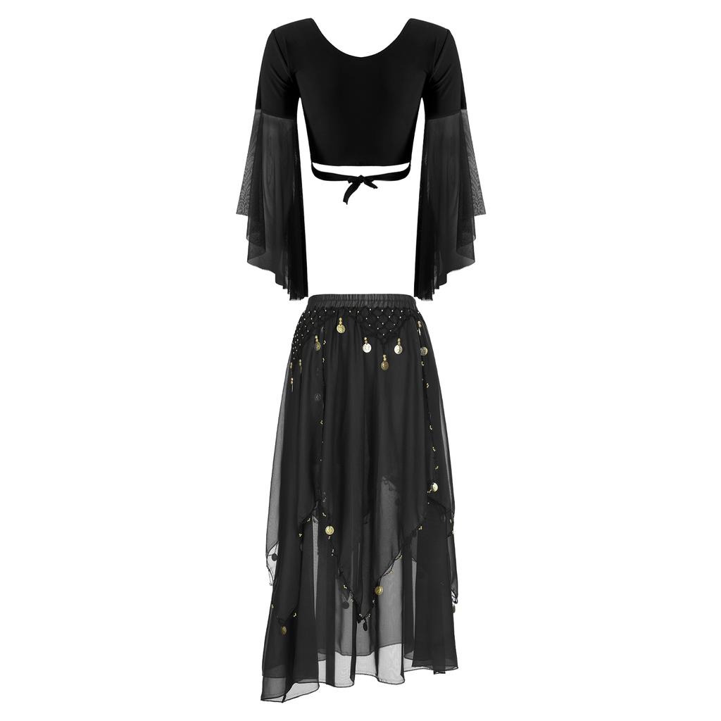 Womens Belly Dance Costume V Neck Lace Up 3/4 Tulle Flare Sleeve Crop Top Sequin Beaded Chiffon Skirt