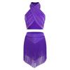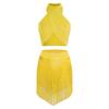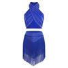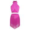 Womens Chacha Salsa Dance Outfit Halter Sleeveless Backless Shiny Ruched Crop Top Tiered Tassels Skirt Built In Shorts