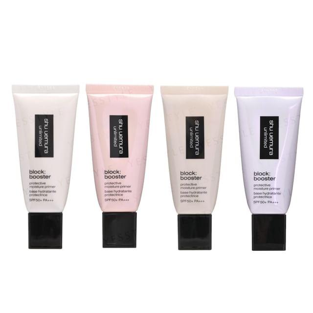 This primer provides UV protection and shields skin from pollutants while keeping it moisturized. Enriched with deep sea water, peony root extract and sunflower seed oil, the formula provides hydration and leaves a refreshing sensation. Available in colorless version and color-correcting shades such as beige, pink and mauve.