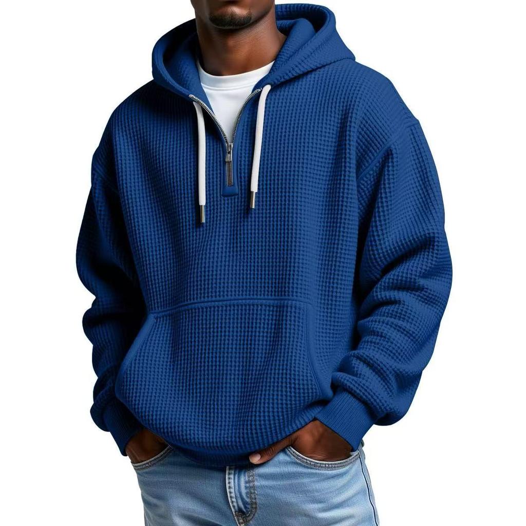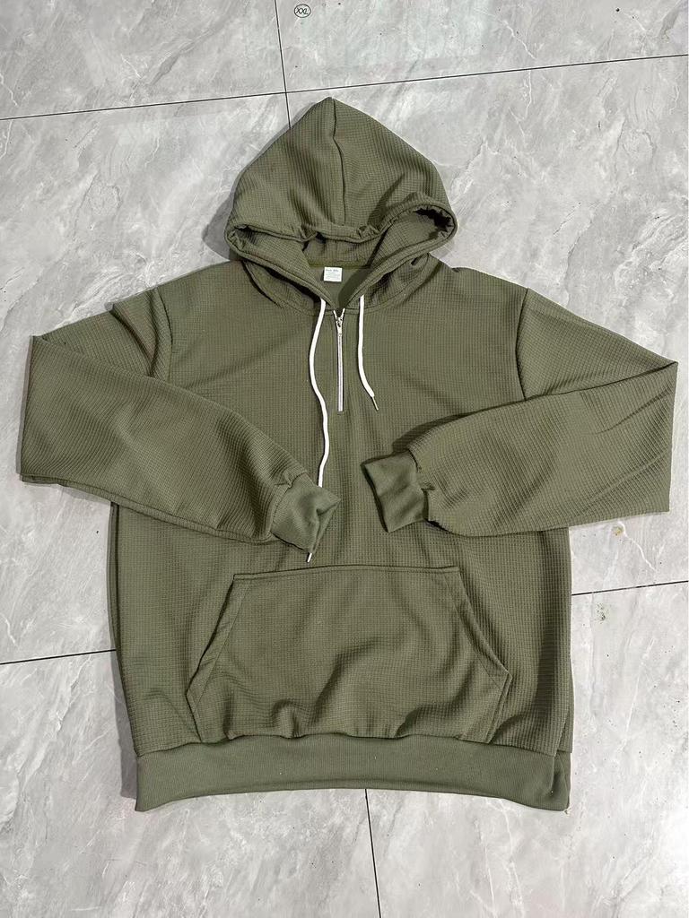 Обновите свой повседневный гардероб этой прочной толстовкой с капюшоном и вафельной текстурой, созданной для максимального комфорта и стиля.. Эта мужская толстовка отличается уникальным воротником-стойкой и свободным кроем, создавая расслабленный, но модный образ.. Изготовлен из прочного полиэфирного волокна, обеспечивает тепло и долговечность в течение различных сезонов.. Однотонный дизайн дополнен деликатным узорным декором, добавляющим нотку утонченности общей минималистичной эстетике.. Идеально подходит для непринужденных прогулок, этот свитшот легко сочетает в себе практичность и современный повседневный стиль.